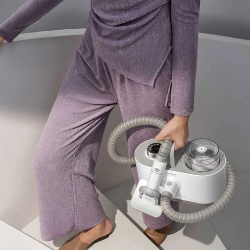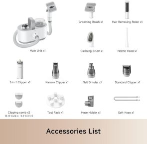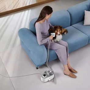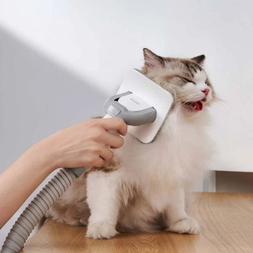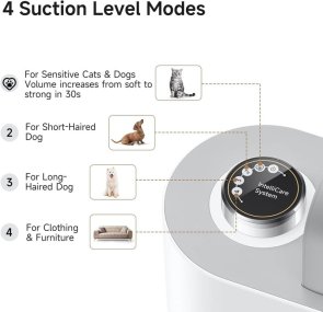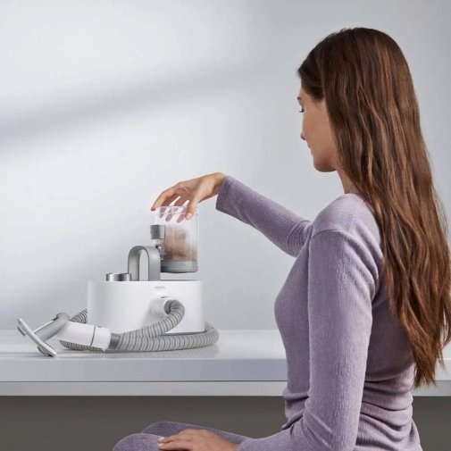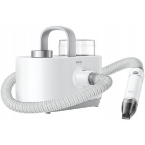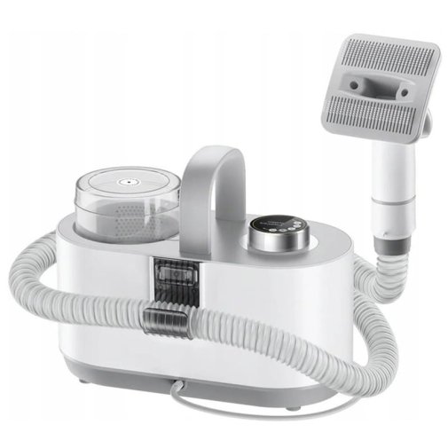 Пристрій працює тихо — близько 36 дБ у режимі Level Care, що мінімізує стрес у тварин і дозволяє легко звикнути до процедур. Компактний дизайн, зручна ручка та довгий шнур живлення 2.5 м з еластичним шлангом 1.5 м забезпечують свободу руху та комфортне використання, створюючи радіус дії до 4 м. Об’єм контейнера для збирання вовни становить 1 літр, що дозволяє проводити кілька сеансів грумінгу без частого очищення.