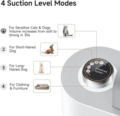 Прилад оснащений системою IntelliCare MOVA-first, що забезпечує адаптивну потужність для різного типу шерсті та потреб домашніх тварин. Режим «Рівномірний догляд» працює тихо — близько 55 дБ, що дозволяє тваринам залишатися спокійними протягом процедури.