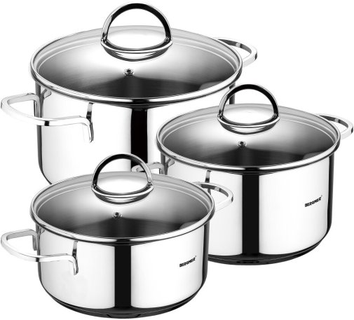 Набір каструль Bergner Classic (BG-6284) виготовлені з нержавіючої сталі. Літраж каструль: 1.7 л, 2.3 л, 3.3 л. В набір також входять удароміцні скляні кришки з отвором для паровідведення. Ручки із нержавіючої сталі, надійно прикріплені методом точкового зварювання.