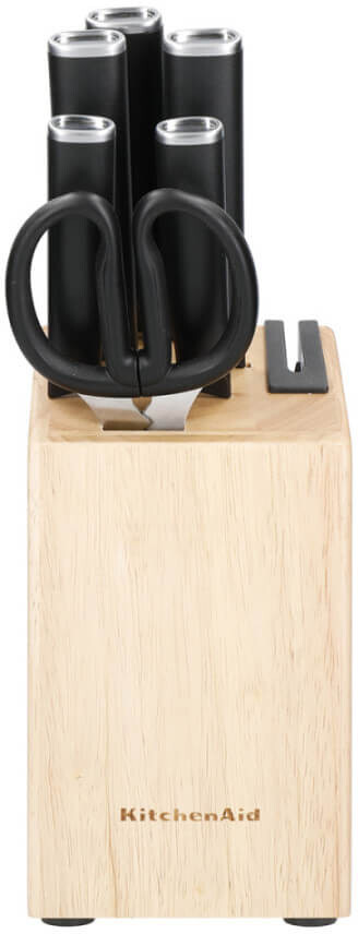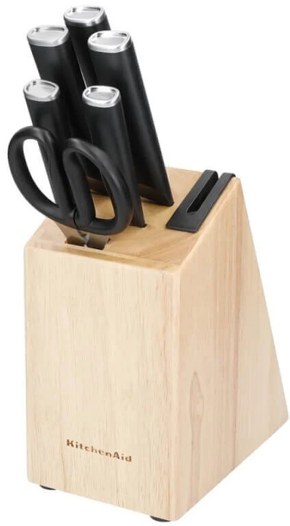 Кожен ніж з набору ножів KitchenAid виготовлений з високовуглецевої японської сталі, що забезпечує довговічну гостроту та надійність при різанні. Ергономічні неслизькі ручки гарантують зручне та надійне тримання ножа під час роботи. Підставка для зберігання з каучукового дерева має вбудовану точилку для легкого заточування ножів перед кожним використанням.