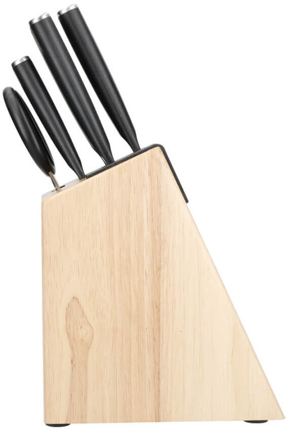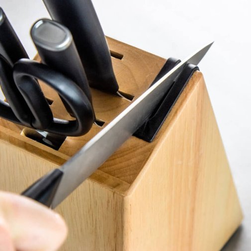 - Вбудована точилка: Сучасний каучуковий блок для зберігання ножів оснащений вбудованою точилкою, що дозволяє швидко і зручно заточити ножі.