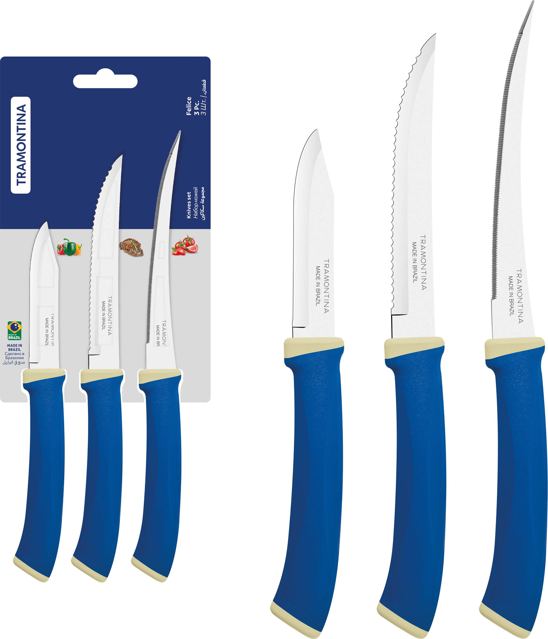 Ножі серії FELICE - ідеальні компаньйони у ваших щоденних кухонних справах. Високоякісна нержавіюча сталь леза, надійні та ергономічні поліпропіленові ручки, що витримують високі температури – ці властивості забезпечують довговічність використання, поєднану з винятковою силою розрізання харчових продуктів. Ручки представлені в класичних чорному та синьому кольорах. Ножі FELICE добре витримують миття в посудомийній машині. Вони створені, щоб максимально спростити вашу кухонну рутину!