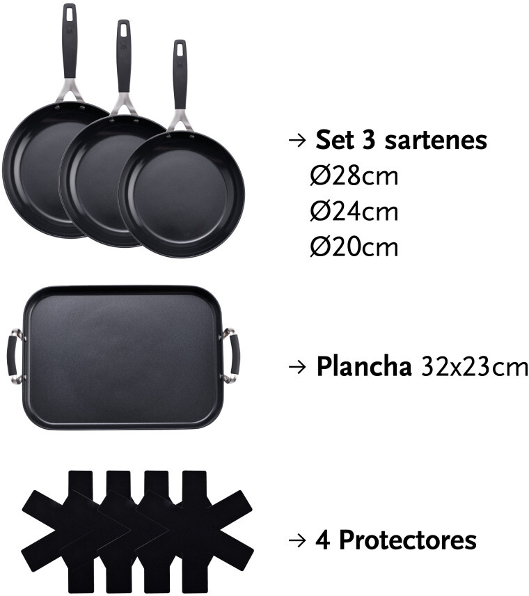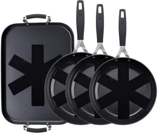 Набір посуду MasterPro Smart включає високоякісний посуд з інноваційною системою складання, що дозволяє економити простір на кухні. Посуд виготовлений із міцного кованого алюмінію з керамічним антипригарним покриттям, що не містить токсичних речовин. Ручки виготовлені з нержавіючої сталі, що забезпечує зручність та безпеку під час використання. Набір призначений для використання на всіх типах плит, включаючи індукційні.