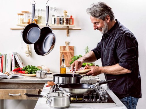 Комфорт та вишуканістьЗ обідками, що спеціально вигнуті для комфортного переливання без крапель, насолоджуйтесь кулінарним комфортом. Індукційна основа з нержавіючої сталі та алюміній всередині гарантують рівномірне розподілення тепла для ідеально приготованих страв.