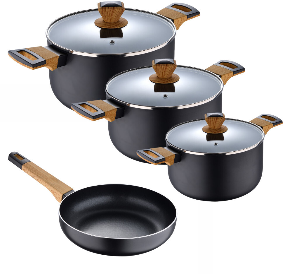 Склад комплекту – 3 каструлі, сковорода, 3 кришки