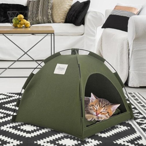 Створює відчуття приватного укриття, що заспокоює котів. Будиночки-тенти часто мають м'яке дно та сітчасті вікна для хорошої вентиляції.