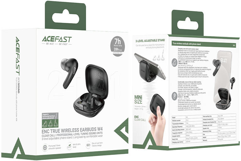 ACEFAST W4 — це бездротові TWS-навушники, які поєднують у собі стильний дизайн, потужний звук і незвичайну додаткову функцію. Компактний зарядний кейс перетворюється на регульовану підставку для смартфона з трьома рівнями нахилу та фіксацією одним кліком – ідеально, щоб дивитися відео чи проводити відеодзвінки без рук. Вага всього комплекту становить лише 37,6 г, а товщина кейса – всього 24 мм, тому він легко поміщається навіть у найменшій кишені.