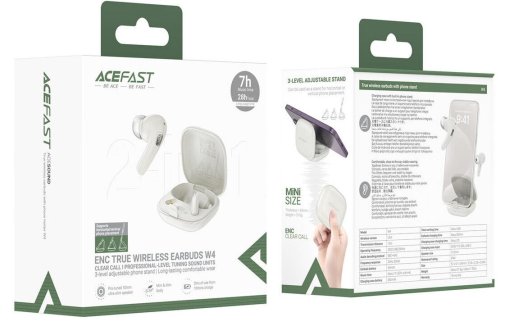 ACEFAST W4 — це бездротові TWS-навушники, які поєднують у собі стильний дизайн, потужний звук і незвичайну додаткову функцію. Компактний зарядний кейс перетворюється на регульовану підставку для смартфона з трьома рівнями нахилу та фіксацією одним кліком – ідеально, щоб дивитися відео чи проводити відеодзвінки без рук. Вага всього комплекту становить лише 37,6 г, а товщина кейса – всього 24 мм, тому він легко поміщається навіть у найменшій кишені.