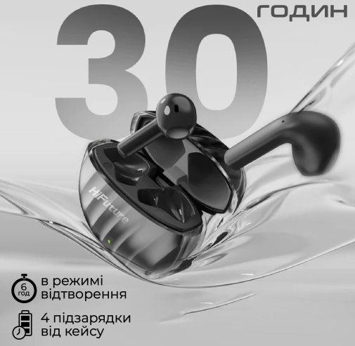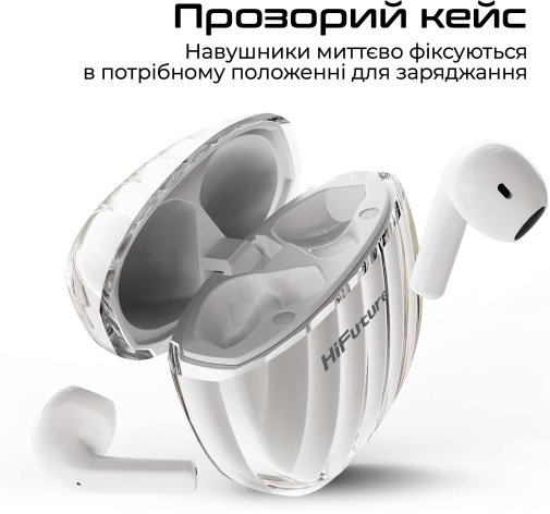 Навушники-вкладиші FlyBuds3 від HiFuture мають велику автономність і стильний зовнішній вигляд завдяки прозорому кейсу. Насолоджуйся музикою цілий день, не переймаючись про зарядку.
