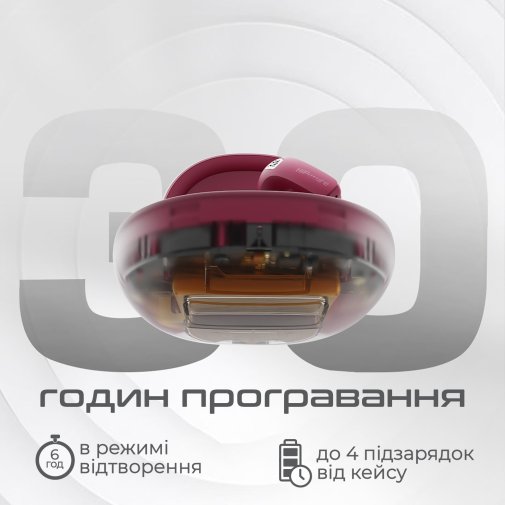 FlyBuds4 будуть програвати музику 7 годин, а за допомогою кейса ти зможеш їх підзарядити до 4 разів.