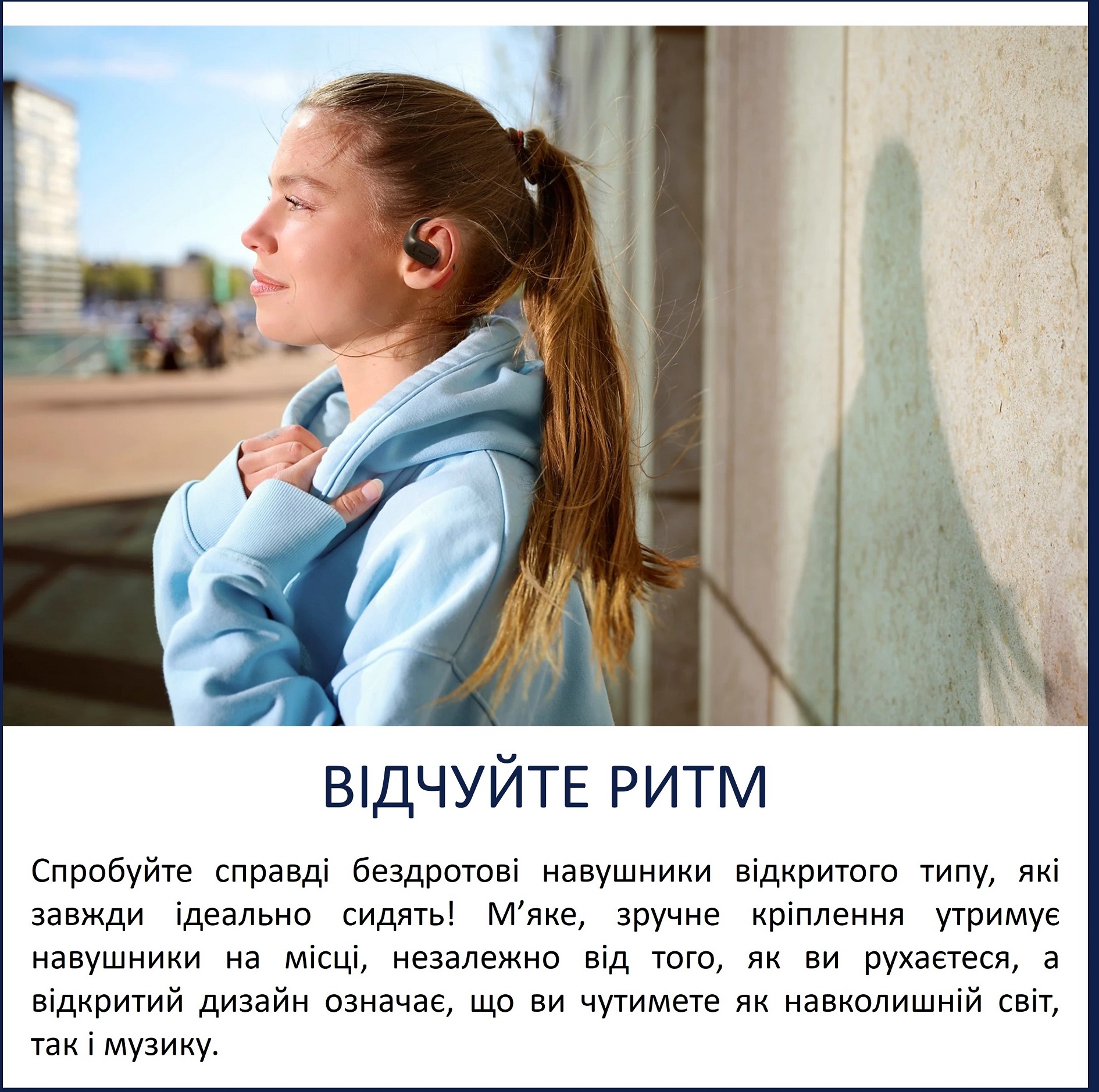 Навушники Philips TAA6709BK/00 — це бездротові спортивні вкладиші відкритого типу, створені спеціально для активного способу життя. Завдяки відкритій конструкції з м’яким кліпс-подібним кріпленням вони надійно фіксуються за вухом, не блокуючи вушний канал. Ви чуєте музику чи подкасти, але при цьому повністю сприймаєте оточення — ідеально для бігу, прогулянок чи тренувань на вулиці, коли важливо залишатися в курсі того, що відбувається навколо.