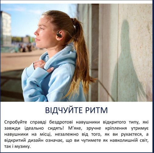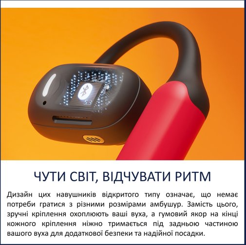 Конструкція з м’яким гумовим якорем і точним кріпленням забезпечує стабільне положення навіть під час інтенсивних рухів. Навушники не випадають, не тиснуть і не викликають дискомфорту при тривалому носінні. Їх легка вага робить використання непомітним, а відкритий дизайн дозволяє вухам «дихати» без відчуття закладеності.