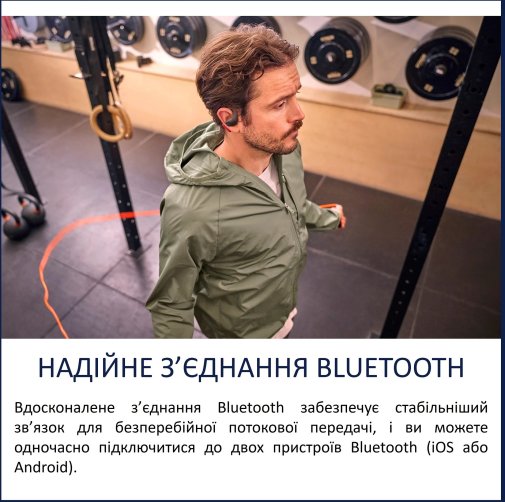 Захист IP55 робить навушники стійкими до поту, пилу та легкого дощу — можна тренуватися в будь-яку погоду. Додатково приємно, що вони виготовлені з 33% переробленого полікарбонату, а упаковка — повністю без пластику та екологічна.