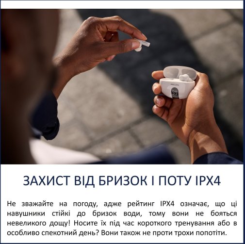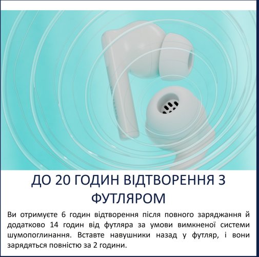 Комфорт під час носіння забезпечують м’які змінні силіконові амбушури, які створюють надійне ущільнення у вушному каналі та додатково зменшують вплив зовнішнього шуму. Захист від бризок і поту за стандартом IPX4 дозволяє використовувати навушники під час тренувань або в дощову погоду без зайвих хвилювань.