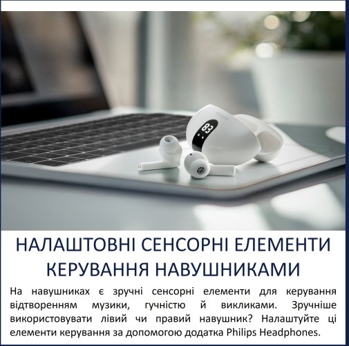 Застосунок Philips Headphones розширює можливості персоналізації: у ньому можна налаштувати сенсорне керування, активувати динамічні баси, скоригувати звучання через вбудований еквалайзер, оновити програмне забезпечення та керувати під’єднаними пристроями.