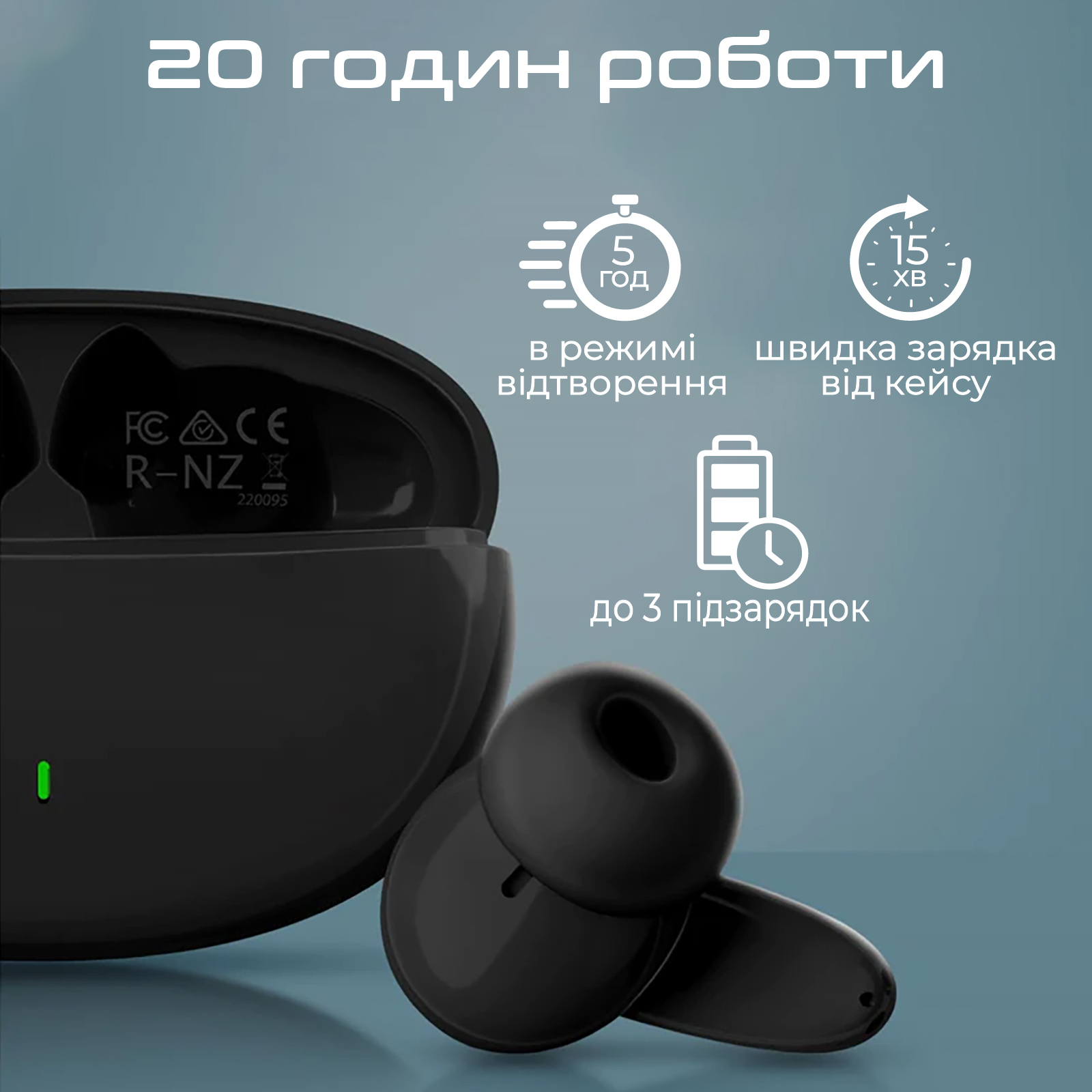Шумоізоляція: ТакТип навушників: ВакуумніПризначення навушників: Для смартфонаВиконання навушників: TWS (повністю бездротові)