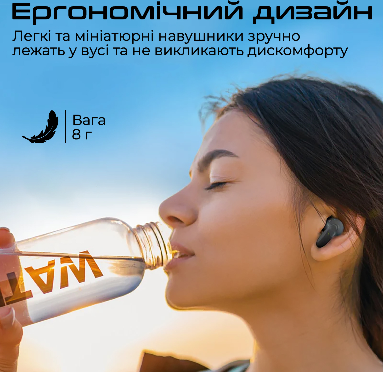 Легкі навушники анатомічно правильної форми. Вони зручно лежать у вусі та не викликають дискомфорту навіть після тривалого використання.