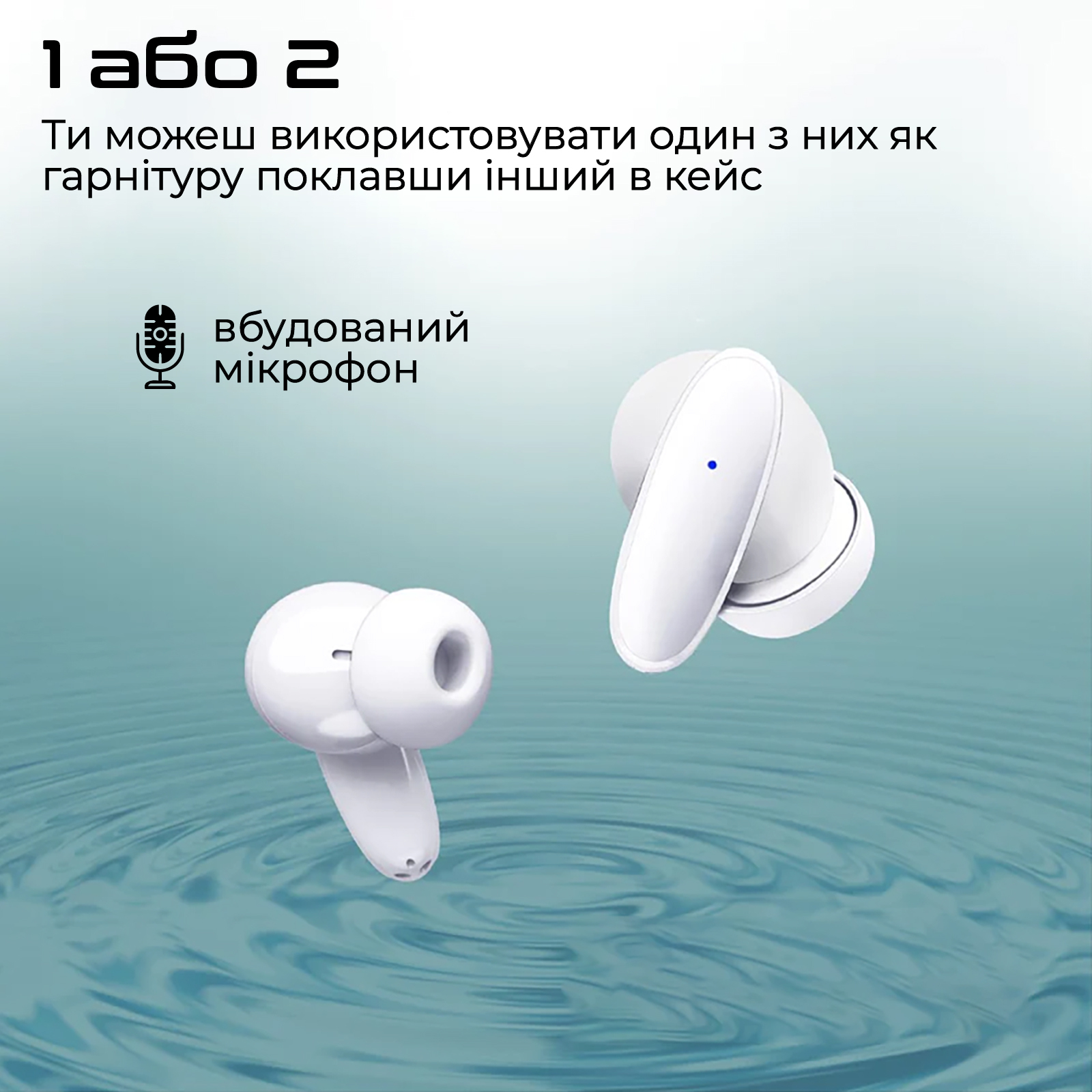 Навушники повністю автономні, ти можеш використовувати один з них як гарнітуру поклавши інший в кейс, без додаткових налаштувань.
