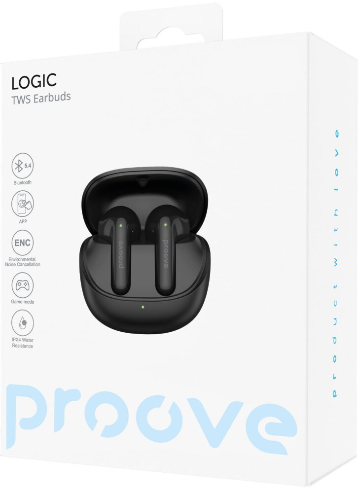 Навушники підтримують роботу з фірмовим застосунком Proove, де можна налаштувати еквалайзер, перепризначити сенсорні елементи керування, увімкнути ігровий режим, режим прозорості та регулювати шумозаглушення (ENC). Захист IPX4 робить Proove Logic стійкими до бризок і поту, тож їх можна використовувати під час тренувань чи прогулянок у дощову погоду. При вазі лише 37 г вони залишаються непомітними навіть при тривалому носінні.