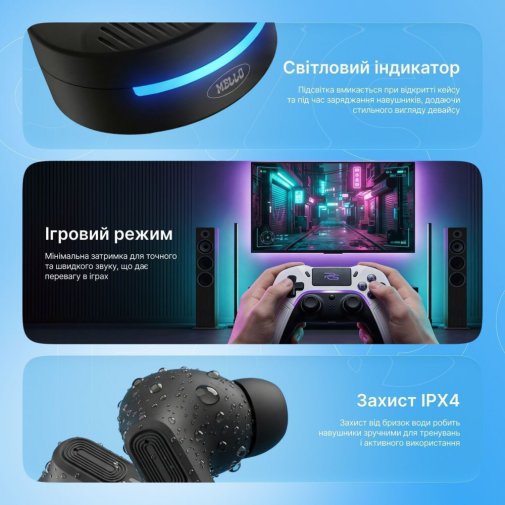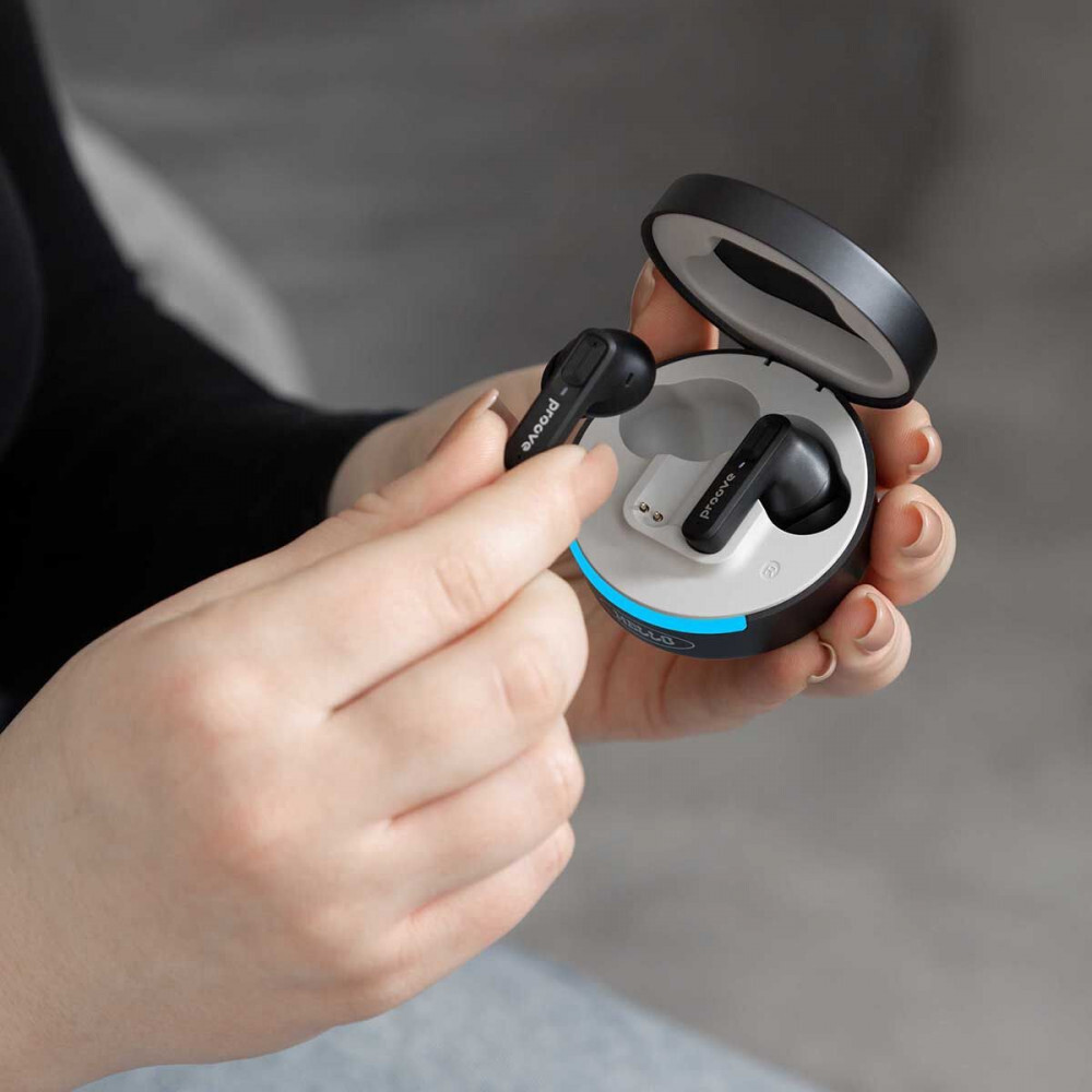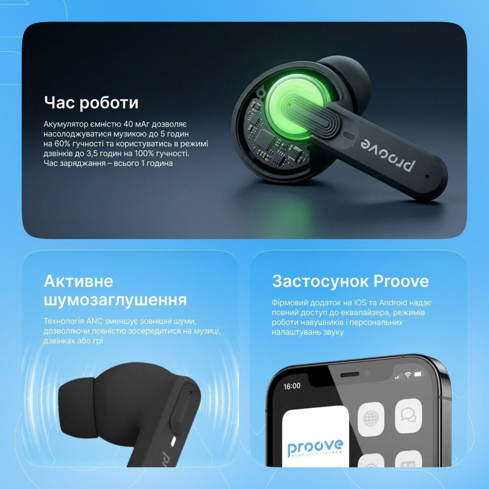 Усіма функціями зручно керувати через сенсорні елементи на корпусі або через фірмовий застосунок Proove, де доступні детальне налаштування та перемикання режимів. Навушники працюють до 5 годин від одного заряду, а компактний зарядний кейс з акумулятором 400 мАг та роз'ємом Type-C повністю заряджається приблизно за годину. Захист IPX4 робить їх стійкими до бризок і поту, тому вони однаково підходять для тренувань і міських прогулянок. LED-індикатори на кейсі та навушниках зручно вказують на рівень заряду.