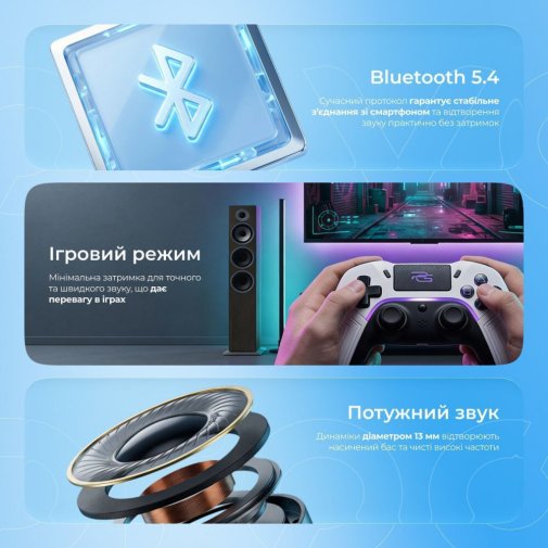 За звук відповідають динамічні драйвери діаметром 13 мм із діапазоном частот 20 Гц–20 кГц та опором 32 Ом, що забезпечують об'ємне, збалансоване звучання з виразними басами та деталізованими високими частотами. Підтримка аудіокодеків AAC і SBC гарантує стабільну передачу музики без помітних спотворень. Активне шумозаглушення ANC ефективно прибирає фоновий шум, дозволяючи зосередитися на музиці чи розмові, а технологія ENC очищує голос під час дзвінків навіть у галасливому оточенні. Режим прозорості дає можливість чути навколишній світ без зняття навушників, коли це потрібно. Ігровий режим знижує затримку аудіо для максимально синхронного звуку при перегляді відео та грі.