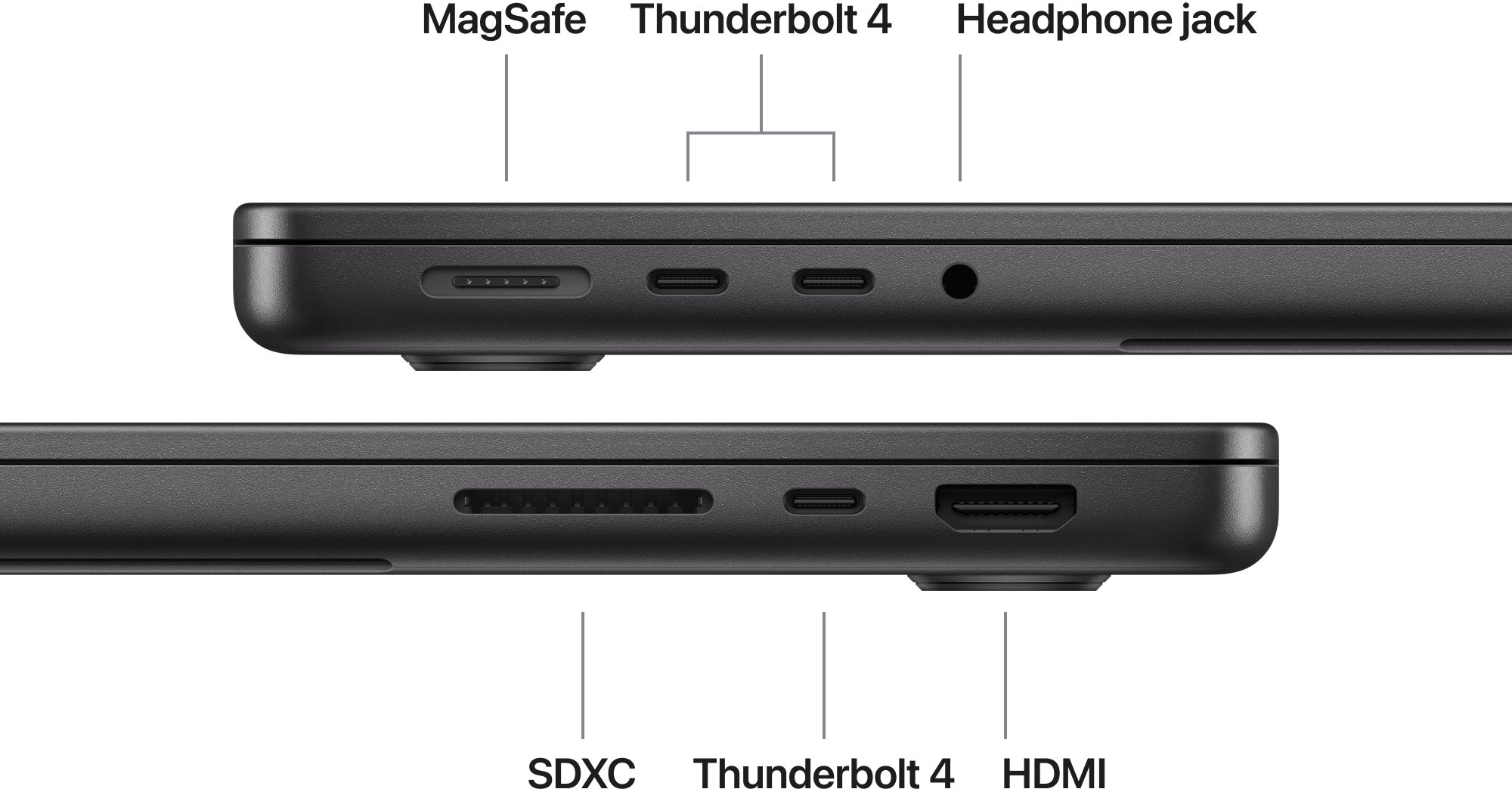 MacBook Pro оснащено безліччю портів для підключення високошвидкісних периферійних пристроїв, дисплеїв з високою роздільною здатністю або прямого вивантаження карт пам'яті SDXC. Крім того, модель з чипом M5 тепер оснащена інтерфейсом Thunderbolt 5, який забезпечує швидкість передачі даних до 120 Гбіт/с.