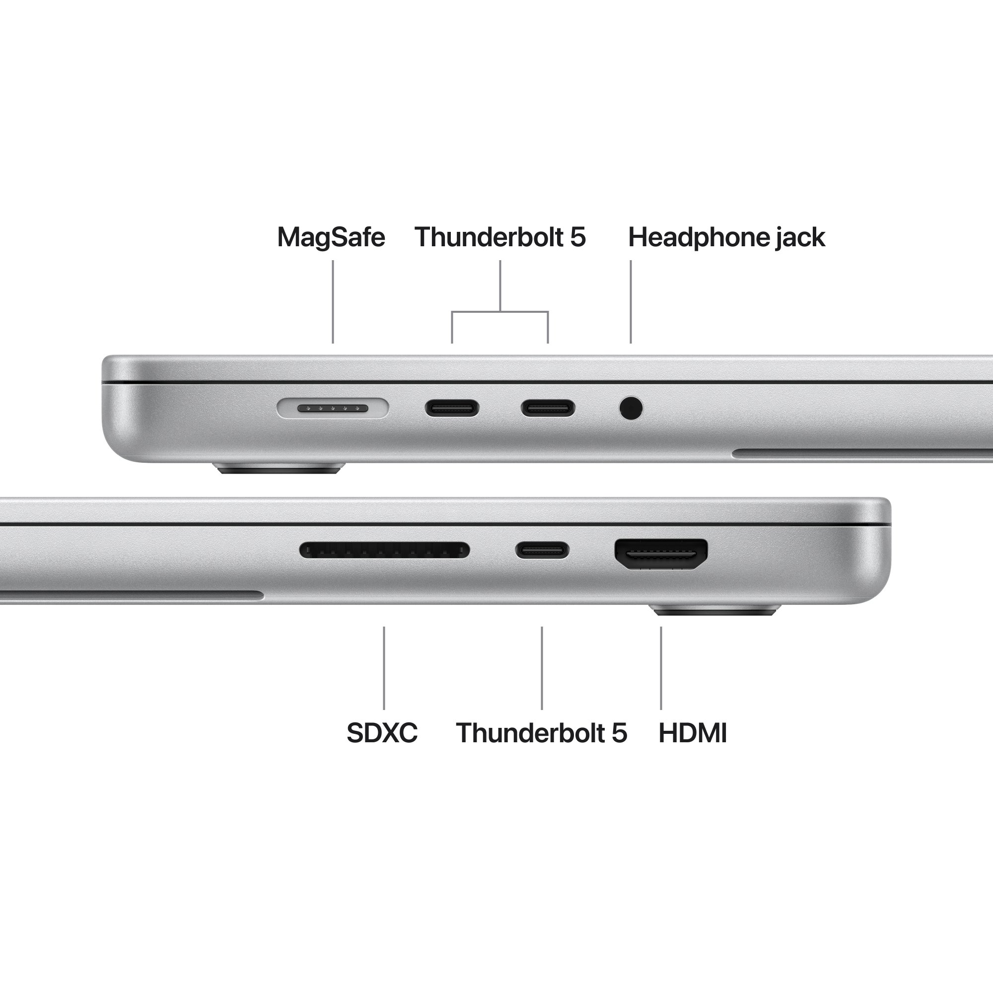 MacBook Pro оснащений трьома портами Thunderbolt, портом HDMI, MagSafe 3, слотом для карт SDXC та роз'ємом для навушників. Пристрій підтрумує Thunderbolt зі швидкістю передачі даних до 120 Гбіт/с. Також присутні Wi-Fi та Bluetooth для бездротового підключення.