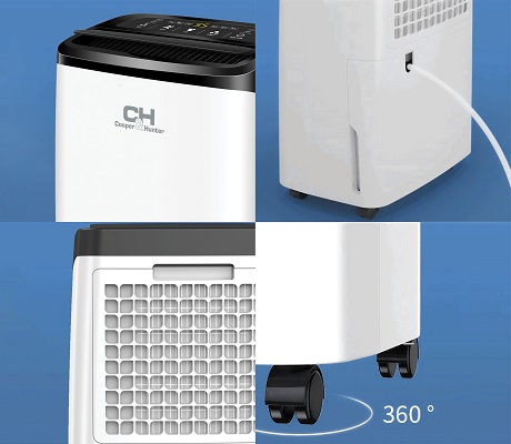 Великий LED-дисплей миттєво відображає поточну та задану вологість у діапазоні 40–70 %. Вбудований Wi-Fi модуль дозволяє керувати осушувачем зі смартфона через додаток Cooper&Hunter Smart з будь-якої точки світу. Дві швидкості вентилятора (до 160 м³/год) забезпечують баланс між блискавичним осушенням та надтихою роботою — лише 36 дБ на мінімальній швидкості.