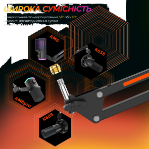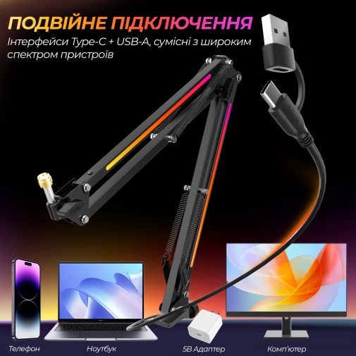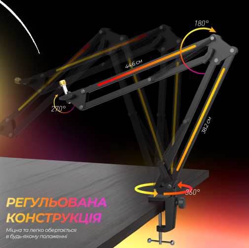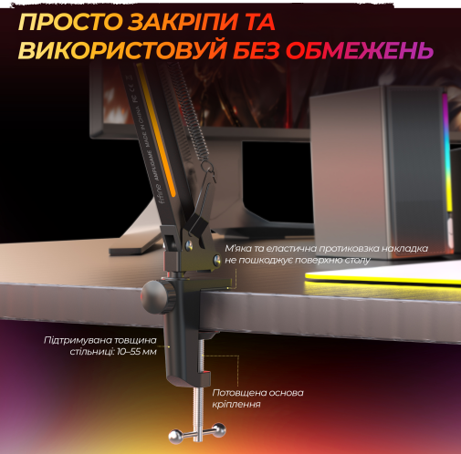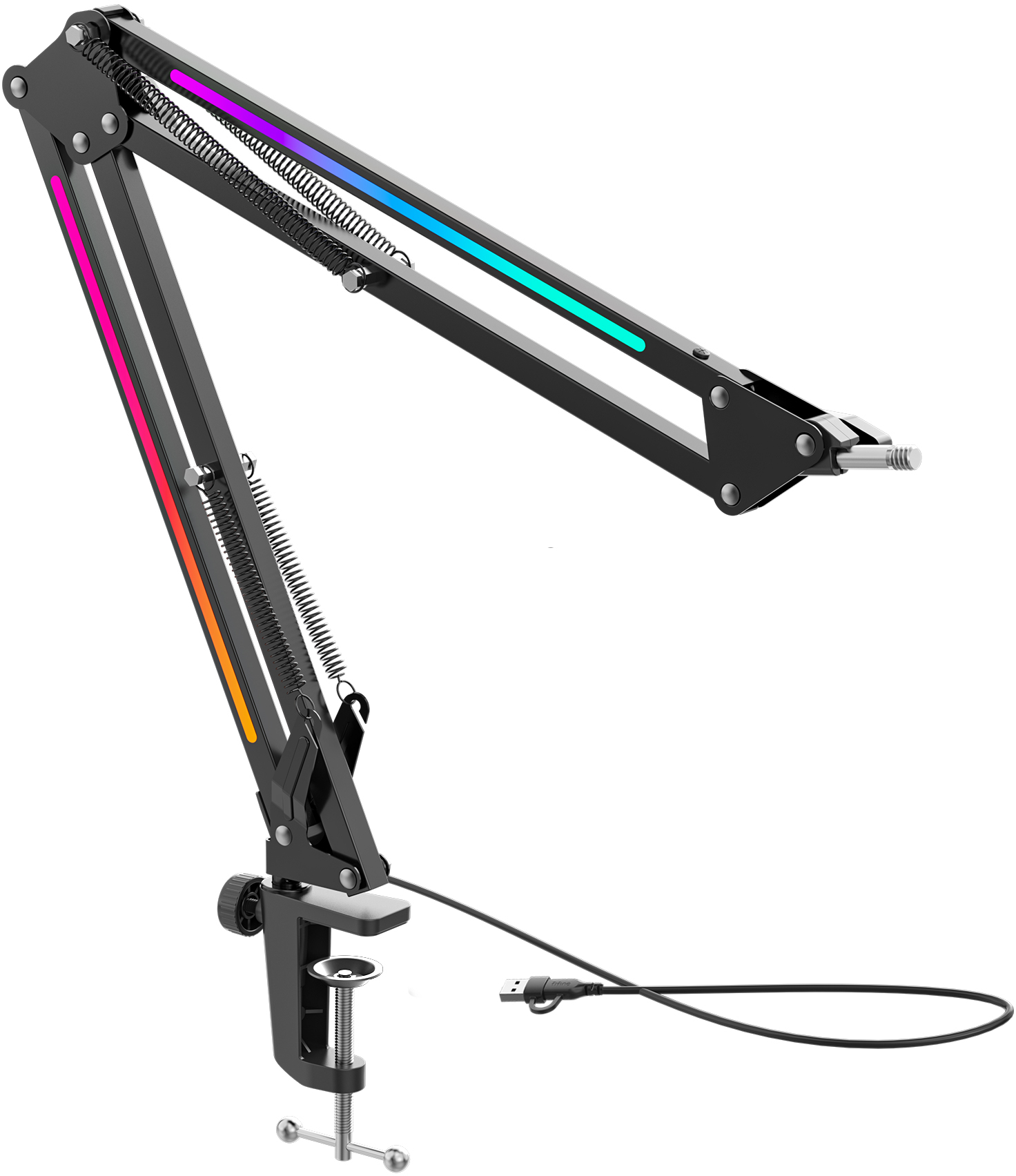 BM38 підходить для мікрофонів зі стандартом кріплення 5/8" та 3/8", а комбінований роз'єм Type-C + USB-A для живлення підсвічування забезпечує підключення до ПК або ноутбука. Міцна струбцина з м'якою антиковзкою прокладкою надійно фіксується на стільниці товщиною від 10 до 55 мм, не пошкоджуючи поверхню. Поворотний механізм дозволяє легко позиціювати мікрофон у будь-якому напрямку, звільняючи місце на столі.