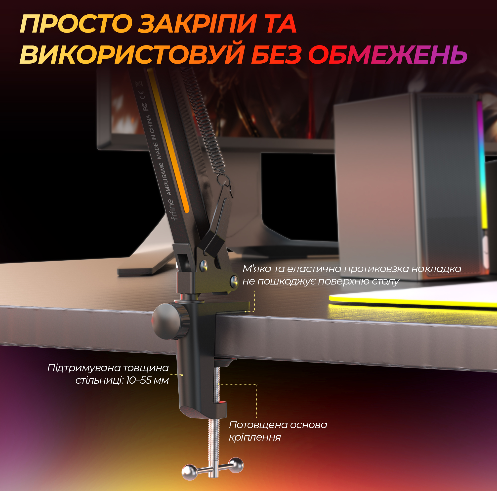 FIFINE AmpliGame BM38 — це не просто стійка пантограф, а продуманий інструмент для комфортної творчості та роботи. Вона поєднує передові технології керування підсвіткою через додаток, надійність інженерної конструкції та турботу про користувача — захист поверхні столу і легке встановлення.