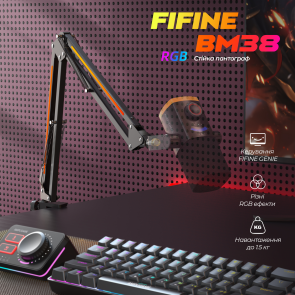 FIFINE AmpliGame BM38 — це сучасна, міцна та функціональна стійка пантограф для мікрофону, створена для тих, хто цінує якість, стиль і зручність. Завдяки інтелектуальному RGB-підсвічуванню, універсальній сумісності та надійній конструкції, вона стане ідеальним рішенням для організації вашого робочого простору.