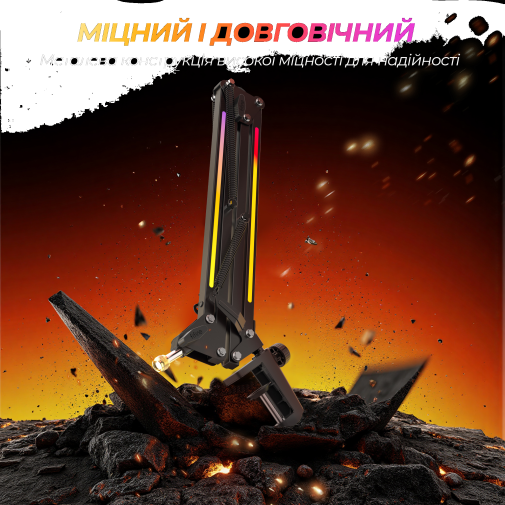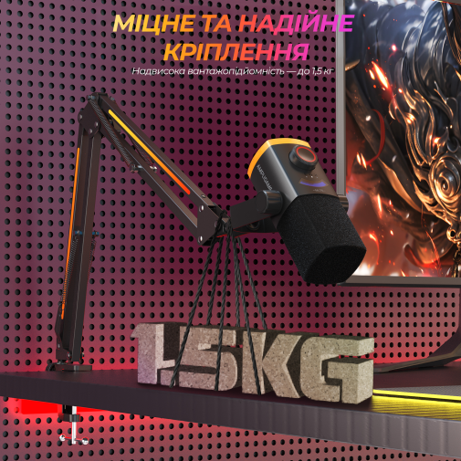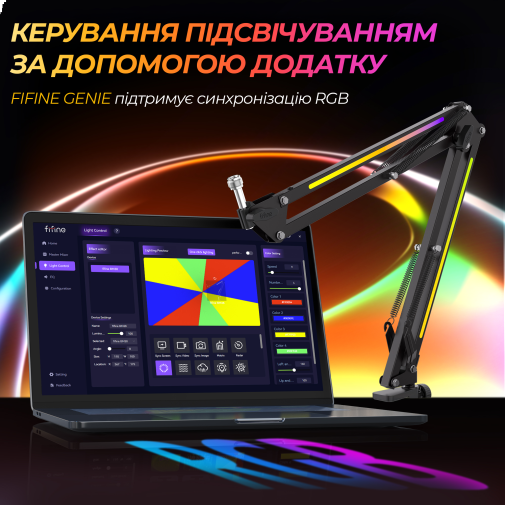 Стійка оснащена інтелектуальним RGB-освітленням, яке синхронізується з іншими пристроями за допомогою додатка FIFINE GENIE, дозволяючи створювати унікальну атмосферу для стрімів, записів або ігор. Конструкція з високоміцного металу витримує навантаження до 1,5 кг, гарантуючи надійне кріплення будь-якого мікрофона.