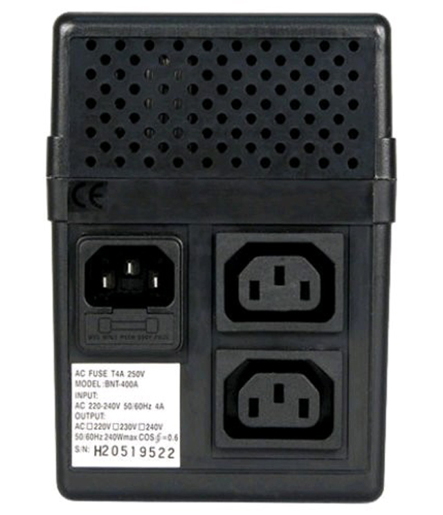Powercom BNT-400A - надійний пристрій безперебійного живлення. Призначений для захисту персонального комп’ютера від найбільш поширених проблем системи електропостачання. Потужність ПБЖ складає 240 Вт, що дозволяє підключити до нього офісну, або робочу системи середнього рівня та монітор. Powercom BNT-400A гарантує працездатність системи, впродовж трьох хвилин при повній відсутності напруги в мережі. Компактний корпус та невелика вага дозволяє легко розмістити його на робочому місці, навіть за умови обмеженого простору.