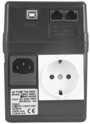 UPS: Powercom BNT-400AP забезпечує захист від перевантажень, при короткому замиканні спрацьовує запобіжник і навантаження знімається, час зарядки 6 годин до 90%, UPS має один індикатор на передній панелі, що оповіщає про активність пристрою, необхідність заміни батареї і перевантаження. Автоматично піднімає напругу на 15% в разі падіння вхідної напруги від 9% до 25% від номінала і опускає на 13% в разі перевищення на 9%-25%.