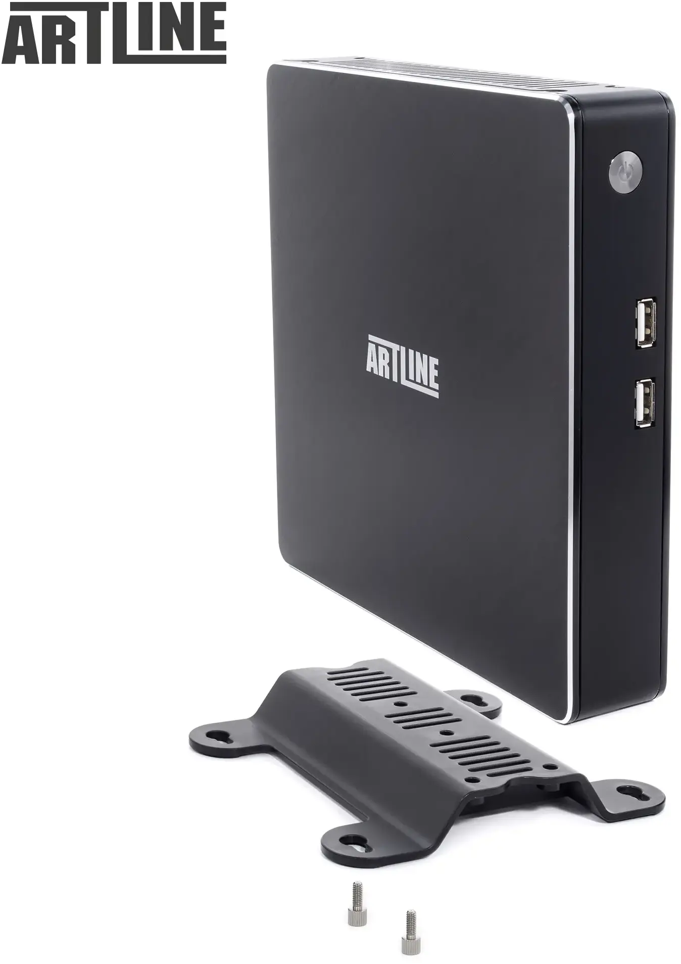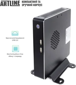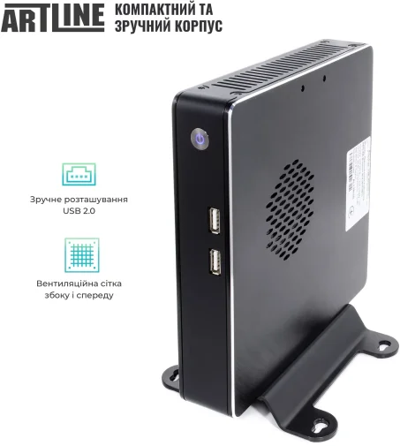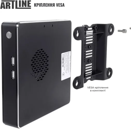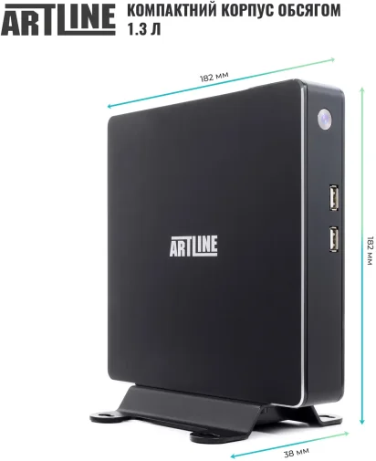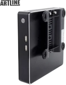Корпус Artline B16 SoC Barebone вирізняється мінімальним дизайном в елегантному чорному кольорі. При розмірах всього 182x38x182 мм і вазі 2 кг, цей неттоп практично не займає місця на робочому столі. Більш того, він підтримує кріплення VESA, що дозволяє розмістити пристрій прямо за монітором або на стіні, звільнивши максимум простору. Такий формат ідеально підходить для сучасних офісів, де цінується порядок та компактність.