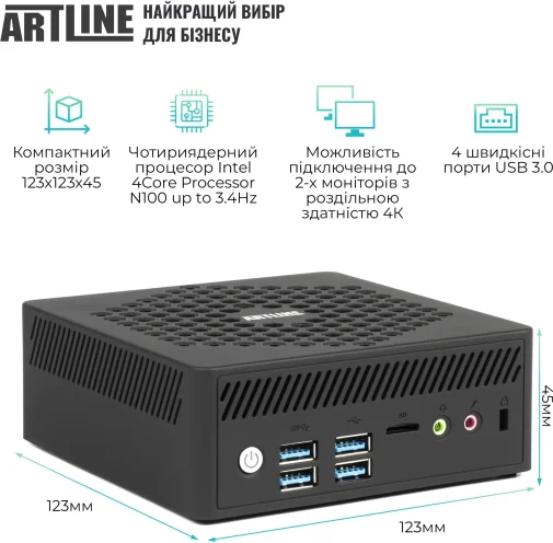 Неттоп ARTLINE Business B14 (B14v20) є комп'ютером для офісу з високою продуктивністю. Він оснащений процесором Intel 4-core Processor N100 з тактовою частотою 3.4 ГГц. Вбудована пам'ять DDR4-3200 SODIMM об'ємом 4 ГБ забезпечує плавну роботу системи. Неттоп має 120 ГБ SSD для зберігання даних. Графічний процесор Intel HD забезпечує непогану якість візуалізації. Завдяки Wi-Fi 802.11ac і Bluetooth 4.0, пристрій забезпечує бездротове підключення до Інтернету та інших пристроїв. Комп'ютер не має операційної системи. Є два порти 1Gb Ethernet для мережевого з'єднання.