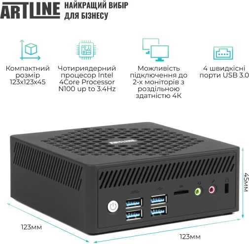 Неттоп ARTLINE Business B14 (B14v29) — практичне офісне рішення на базі енергоефективного Intel N150 (4 ядра, до 3,6 ГГц) з 8 ГБ DDR4-3200 і SSD 240 ГБ. Пристрій оснащений набором необхідних портів (HDMI, DisplayPort, D-Sub, 4xUSB 3.0, microSD, 2xLAN), модулем Wi-Fi 802.11ac і Bluetooth 4.0, підтримує VESA-кріплення і забезпечує стабільну роботу в офісних завданнях.