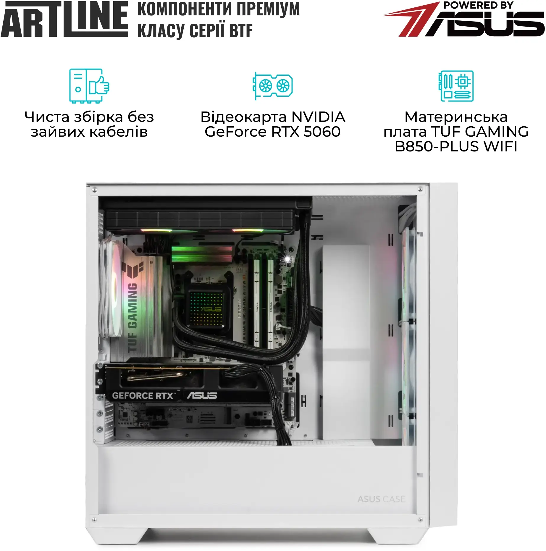 Комп’ютер ARTLINE Gaming A21WHITE (A21WHITEv07) Powered by ASUS – білий ігровий системний блок із водяним охолодженням 240mm WaterCooler White та яскравою RGB-підсвіткою. Має 8-ядерний AMD Ryzen 7 9700X (3.8–5.5GHz, розблокований множник), 32GB DDR5-6000 і швидкісний SSD 1TB M.2 NVMe Gen4. Відеокарта NVIDIA GeForce RTX 5060 8GB підтримує виходи 1×HDMI 2.1b і 3×DisplayPort 2.1b. Материнська плата TUF GAMING B850-PLUS WIFI на чипсеті AMD B850 оснащена Wi-Fi 7 (802.11be), Bluetooth 5.4 та мережею 2.5Gb, а також має широкий набір портів: DisplayPort, HDMI, USB-C 3.2 Gen 2x2, USB 3.2 Gen2/Gen1 і аудіороз’єми. Корпус ASUS A21 PLUS TG ARGB White з вентиляційною сіткою та загартованим склом 4 мм, система охолодження: 3×120mm RGB спереду, 1×120mm RGB ззаду та 2×120mm RGB зверху. Блок живлення 700W 80+ Bronze, передні порти – 2×USB 3.2 Gen1 та Audio. Комплектація: ПК, техпаспорт, кабель живлення; розміри без пакування 430×220×465 мм, вага 11 кг.