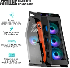 ARTLINE Gaming STLKR (STLKRv108) – ігровий системний блок у корпусі QUBE STALKER MAX Black-Orange із загартованим склом 4 мм та RGB-підсвіткою. Конфігурація на AMD Ryzen™ 7 7700 (8 ядер, 3.8–5.3 ГГц, розблокований множник) і чипсеті AMD B650 (PRIME B650M-A), з оперативною пам’яттю 16GB DDR5-5600 та швидким SSD 1TB M.2 NVMe. Відеокарта – NVIDIA® GeForce® RTX 5060 8GB з виходами 1×HDMI 2.1b та 3×DisplayPort 2.1b. Охолодження: 240mm WaterCooler Black і вентилятори 3×120mm RGB (Front) + 1×120mm RGB (Rear) + 2×120mm RGB (Top). Блок живлення 650W 80+ Bronze, мережа 2.5Gb, операційна система відсутня. Порти корпусу: 1×USB3.0, 2×USB2.0, Audio; на материнській платі – DisplayPort, HDMI, D-Sub, 2×USB 3.2 Gen2, 2×USB 3.2 Gen1, 4×USB2.0, PS/2, 3 аудіороз’єми, Realtek 2.5Gb Ethernet і кнопка BIOS FlashBack. Розміри без пакування: 555×245×685 мм, вага 12 кг; у пакуванні: 655×260×785 мм, 14 кг. Комплектація: ПК, техпаспорт, кабель живлення.