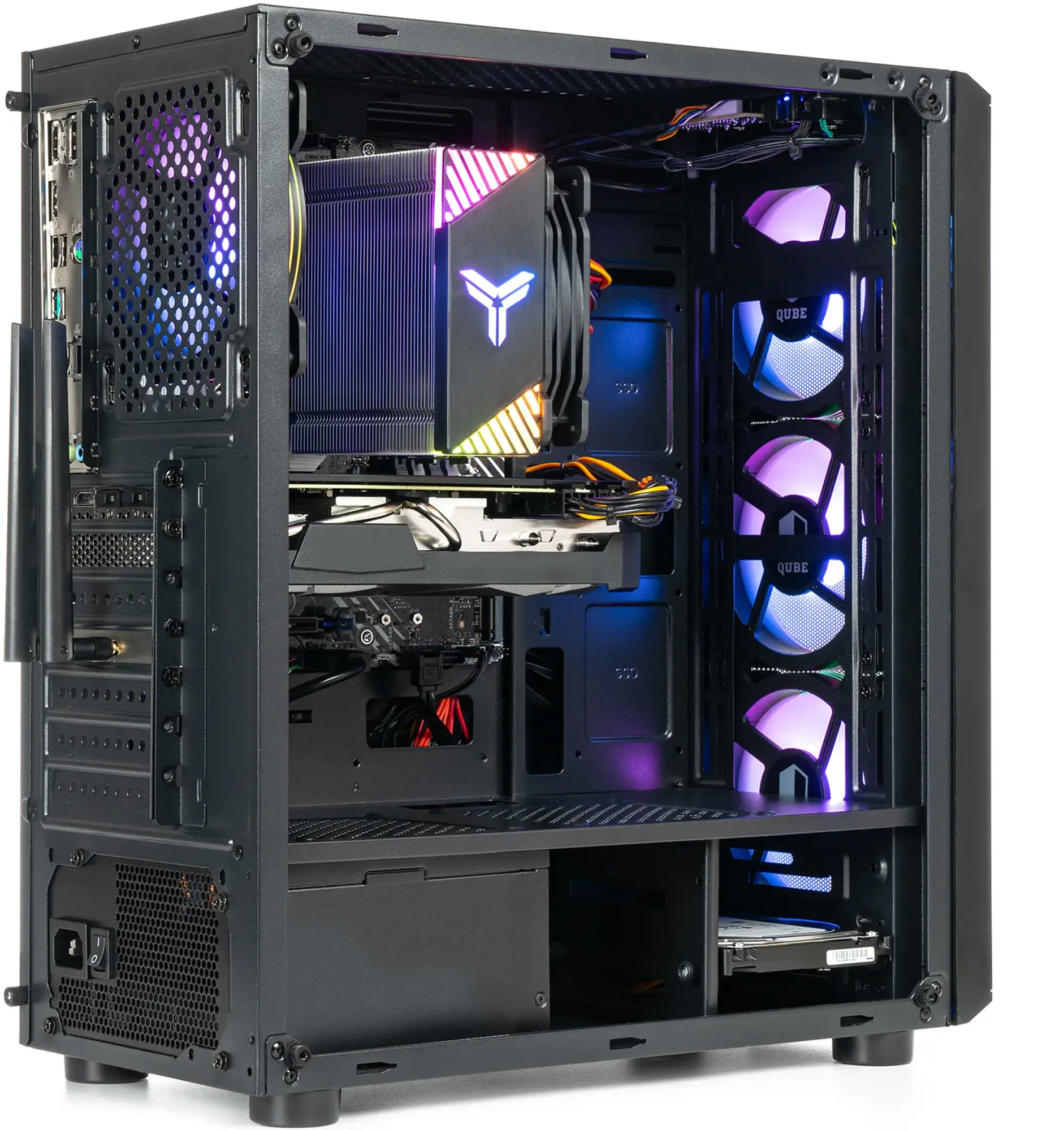 Комп'ютер ARTLINE Gaming X46 (X46v42) – сучасне рішення для геймерів, побудоване на основі процесора AMD Ryzen 5 9600X (6 ядер, 3.9-5.4 GHz) у поєднанні з відеокартою AMD Radeon RX 9060 XT 8GB. Система укомплектована 32GB DDR5-6000 оперативної пам’яті та швидким накопичувачем 1TB NVMe SSD, що гарантує швидке завантаження ігор та програм. За стабільну роботу відповідає блок живлення потужністю 600W, а материнська плата ASRock B650M-HDV/M.2 забезпечує підтримку сучасних технологій і можливість подальшого апгрейду. ПК постачається без ОС, що дозволяє користувачеві вибрати найбільш підходящу для своїх цілей. Корпус має строгий і водночас ефектний вигляд: загартоване скло 4 мм на боковій панелі дозволяє милуватися підсвіткою компонентів. На фронтальній частині встановлені вентилятори з 5-кольоровою LED підсвіткою, які створюють яскравий акцент. Для практичності передбачено пиловий фільтр на верхній панелі, що допомагає підтримувати систему в чистоті.