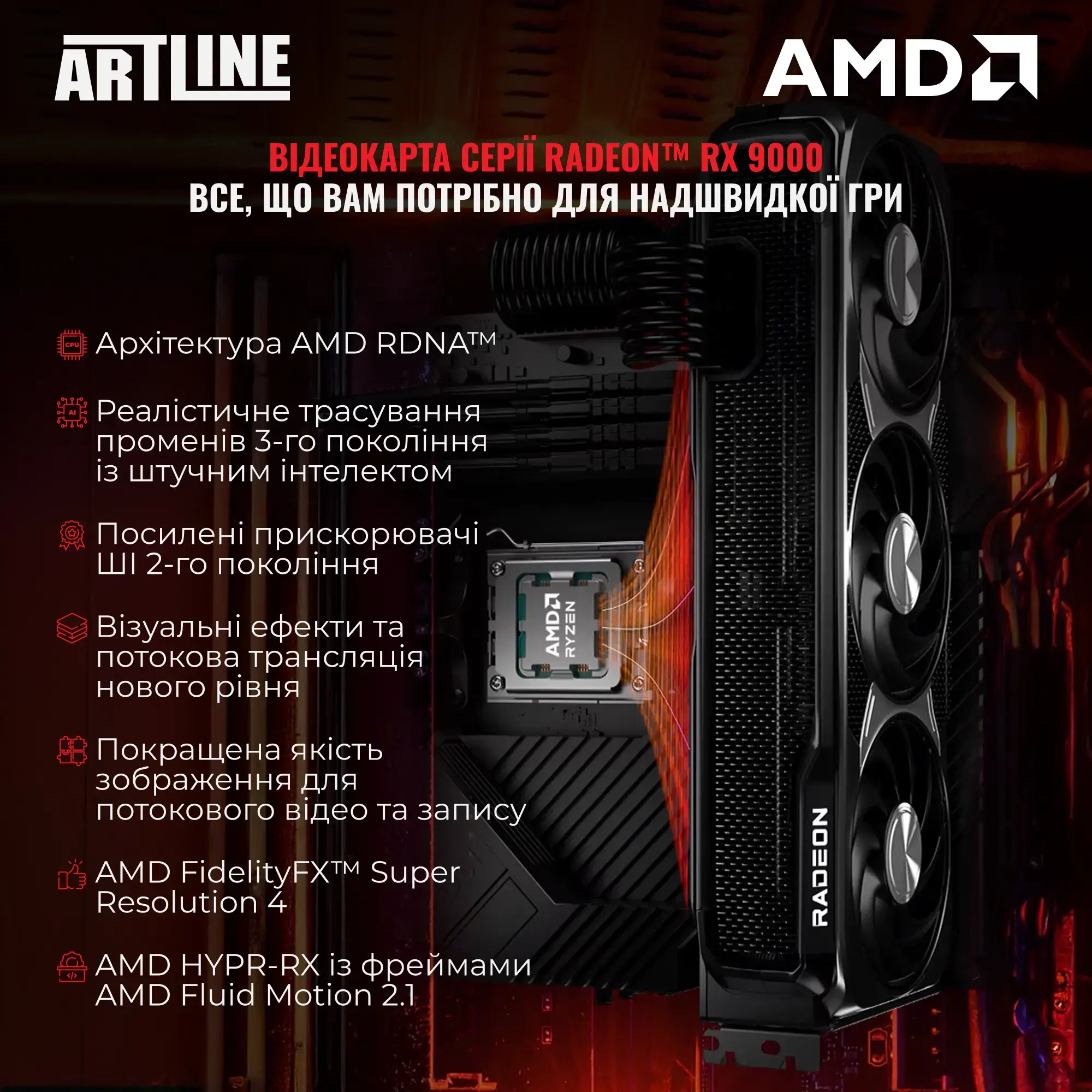 Комп'ютер ARTLINE Gaming X49 Windows 11 Home (X49v74Win) – сучасне рішення для геймерів, побудоване на основі процесора AMD Ryzen 7 9700X (8 ядер, 3.8-5.5 GHz) у поєднанні з відеокартою AMD Radeon RX 9060 XT 16GB. Система укомплектована 64GB DDR5-6000 оперативної пам’яті та швидким накопичувачем 1TB NVMe SSD, що гарантує швидке завантаження ігор та програм. За стабільну роботу відповідає блок живлення потужністю 600W, а материнська плата ASRock B650M-HDV/M.2 забезпечує підтримку сучасних технологій і можливість подальшого апгрейду. ПК постачається з Windows 11 Home. Корпус має строгий і водночас ефектний вигляд: загартоване скло 4 мм на боковій панелі дозволяє милуватися підсвіткою компонентів. На фронтальній частині встановлені вентилятори з 5-кольоровою LED підсвіткою, які створюють яскравий акцент. Для практичності передбачено пиловий фільтр на верхній панелі, що допомагає підтримувати систему в чистоті.