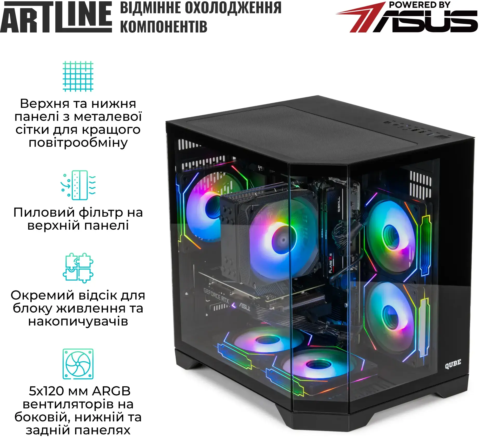 ARTLINE Gaming X61 (X61v32) – продуктивний ігровий системний блок на базі 6-ядерного AMD Ryzen 5 8400F та відеокарти GeForce RTX 5050 8GB для комфортного геймінгу та роботи з мультимедіа. 16GB DDR5-5600 та швидкий SSD 1TB M.2 NVMe забезпечують високу швидкість завантаження ігор та програм. Баштове ARGB-охолодження та п'ять RGB-вентиляторів підтримують стабільну роботу під навантаженням. Корпус QUBE CRYSTAL Black із загартованим склом та продуманою вентиляцією ефектно доповнює стиль складання.