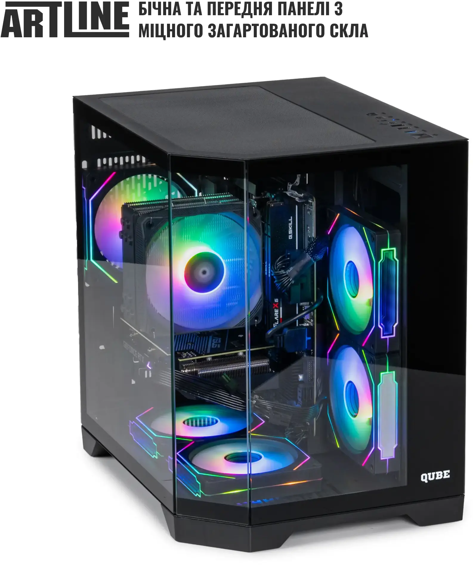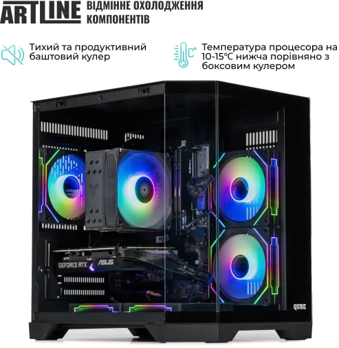 ARTLINE Gaming X63 (X63v41) – потужний ігровий системний блок з 8-ядерним AMD Ryzen 7 7700 та відеокартою GeForce RTX 5050 8GB для високих показників у сучасних іграх та важких завданнях. 16GB DDR5-5600 та швидкий SSD 2TB M.2 NVMe Gen4 забезпечують миттєве завантаження системи та великий обсяг пам'яті для ігор та проектів. Баштове ARGB-охолодження та п'ять RGB-вентиляторів підтримують стабільні температури при максимальному навантаженні. Корпус QUBE CRYSTAL Black із загартованим склом доповнює стиль складання, а блок живлення 650W 80+ Bronze гарантує надійність та енергоефективність.