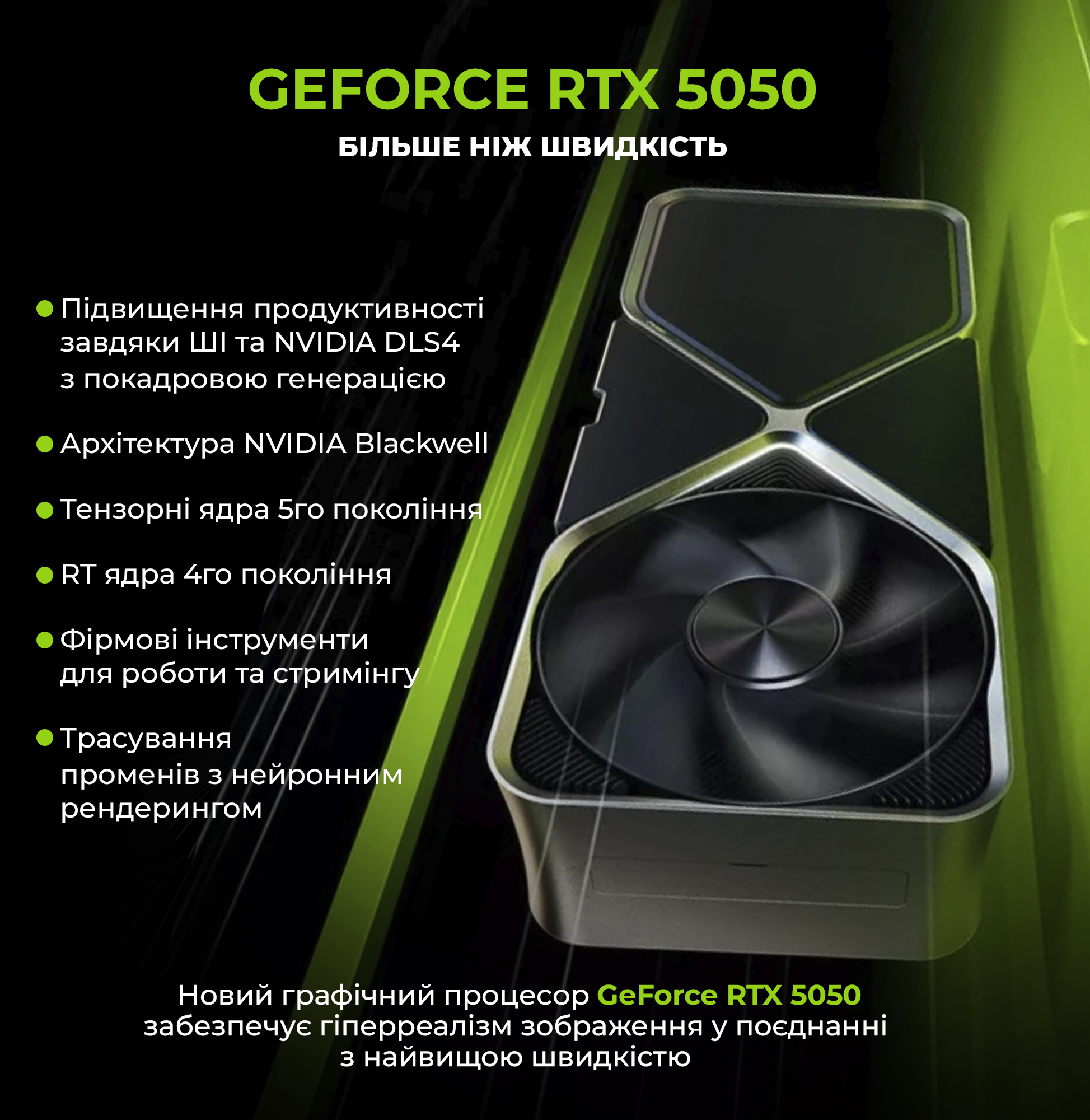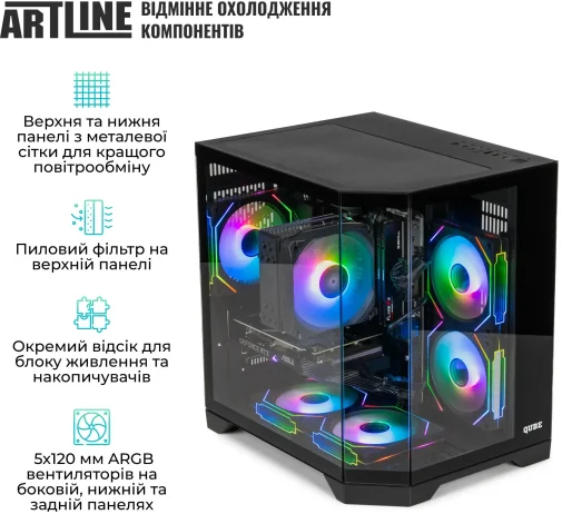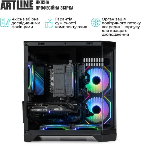 ARTLINE Gaming X63 Windows 11 Home (X63v41Win) – потужний ігровий системний блок з 8-ядерним AMD Ryzen 7 7700 та відеокартою GeForce RTX 5050 8GB для високих налаштувань у сучасних іграх та вимогливих додатках. 16GB DDR5-5600 та швидкий SSD 2TB M.2 NVMe Gen4 забезпечують блискавичне завантаження та великий запас пам'яті під ігри та проекти. Попередньо встановлена Windows 11 Home дозволяє почати користуватися ПК відразу після підключення. Баштове ARGB-охолодження та п'ять RGB-вентиляторів підтримують стабільні температури, а блок живлення 650W 80+ Bronze гарантує надійність та енергоефективність.
