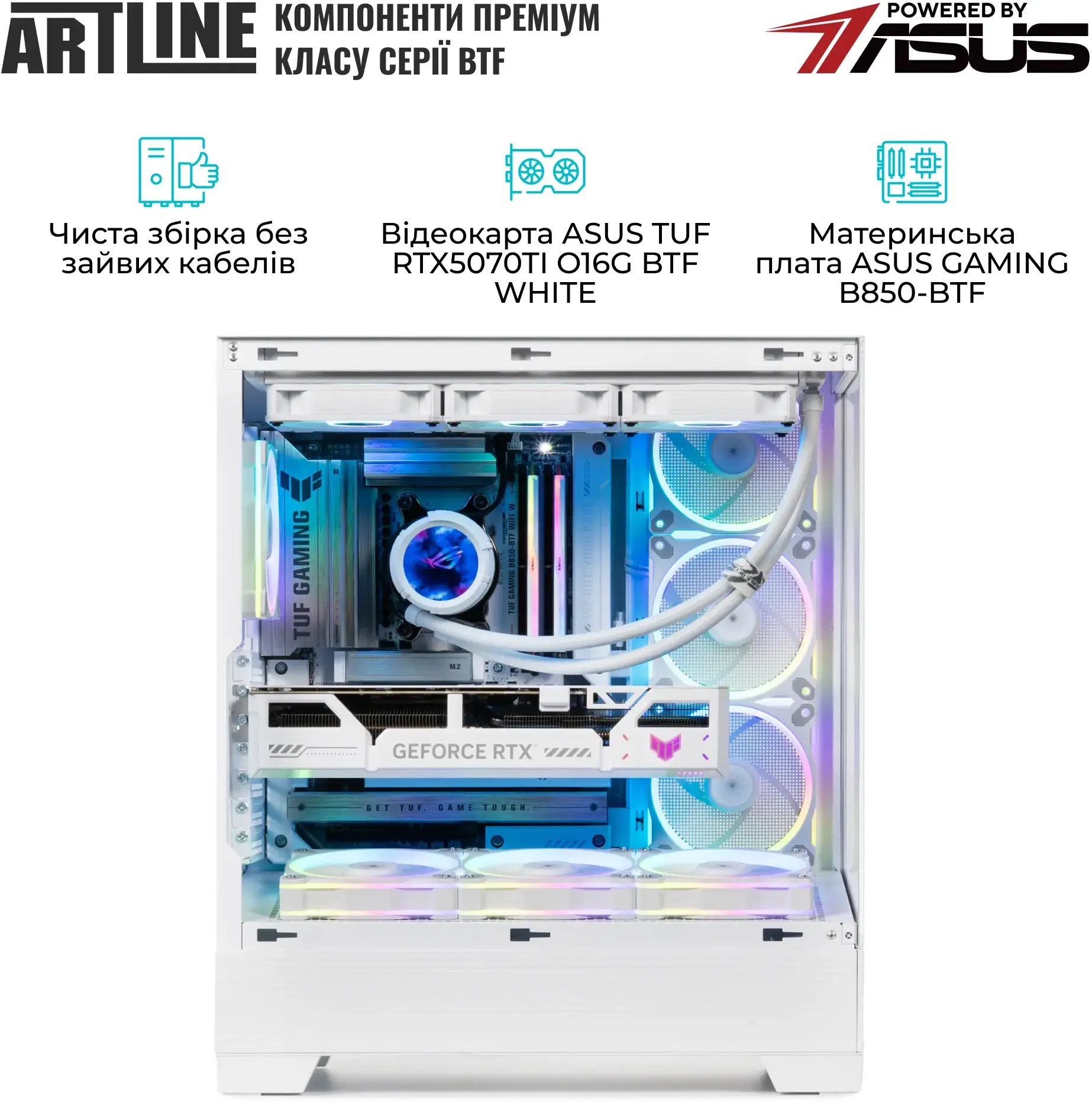 ARTLINE Overlord BTF Windows 11 Pro (BTFv07win) – топовий ігровий ПК з водяним охолодженням у ефектному білому корпусі ASUS A31 PLUS TG ARGB з панелями із загартованого скла. Потужний 8-ядерний процесор AMD Ryzen 7 7700X та відеокарта GeForce RTX 5070 Ti 16GB забезпечують високий FPS у сучасних іграх та відмінну продуктивність для стримінгу та творчості. 32GB DDR5-6000 RGB та надшвидкий SSD 2TB NVMe Gen4 гарантують миттєвий запуск Windows 11 Pro, ігор та ресурсомістких додатків. Система водяного охолодження 360 мм, блок живлення 1000W 80+ Bronze та продумана вентиляція підтримують стабільні температури під навантаженням, а модуль Wi-Fi 7 та Bluetooth 5.4 забезпечують сучасний бездротовий зв'язок.