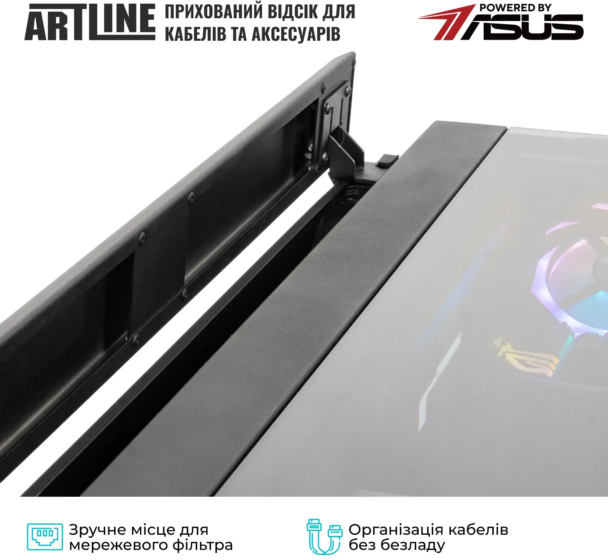 Комп'ютер ARTLINE Overlord DESK Windows 11 Pro (DESKv03Win) — це високопродуктивний ігровий і кастомний ПК, інтегрований в корпус-стіл, оснащений 8-ядерним процесором AMD Ryzen 7 9800X3D 4.7-5.2 ГГц, потужною графікою NVIDIA GeForce RTX 5090 32 ГБ, 64 ГБ високошвидкісної DDR5-6400 пам'яті та швидким SSD 2TB M.2 NVMe. Система охолоджується премиальной 360-мм СВО, працює на базі материнської плати ROG STRIX X870-F GAMING WIFI, має розширені можливості підключення (включаючи LAN 2.5 ГБ, Wi-Fi 7 і Bluetooth) і надійний блок живлення 1200W 80+ Gold. Підходить для топового геймінгу, професійних завдань та ентузіастів, які цінують продуктивність та унікальний форм-фактор.
