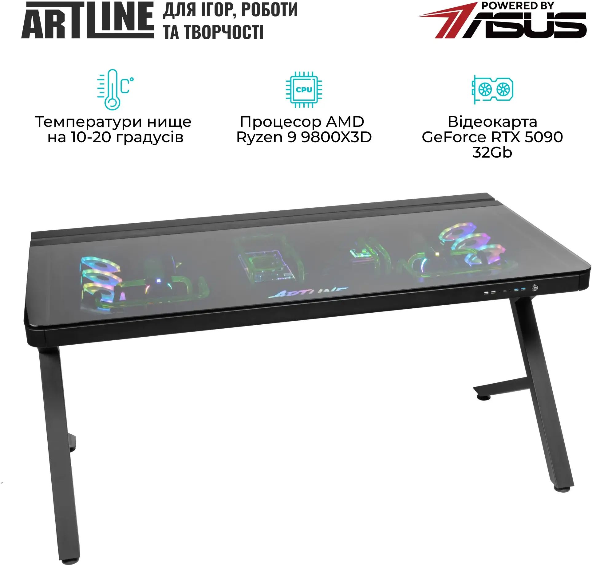 Комп'ютер ARTLINE Overlord DESKPro Windows 11 Pro (DESKProv18Win) — це високопродуктивний ігровий і кастомний ПК, інтегрований в корпус-стіл, оснащений 24-ядерним процесором Intel Core Ultra 9 285K 3.2-5.7 ГГц, потужною графікою NVIDIA GeForce RTX 5080 16 ГБ, 64 ГБ високошвидкісної DDR5-6400 пам'яті та швидким SSD 2TB M.2 NVMe. Система охолоджується преміальною СВО від EKWB, працює на базі материнської плати TUF GAMING Z890-PRO WIFI, має розширені можливості підключення (включаючи LAN 2.5 ГБ, Wi-Fi 7 і Bluetooth) і надійний блок живлення STRIX 1000W 80+ Gold. Підходить для топового геймінгу, професійних завдань та ентузіастів, які цінують продуктивність та унікальний форм-фактор.