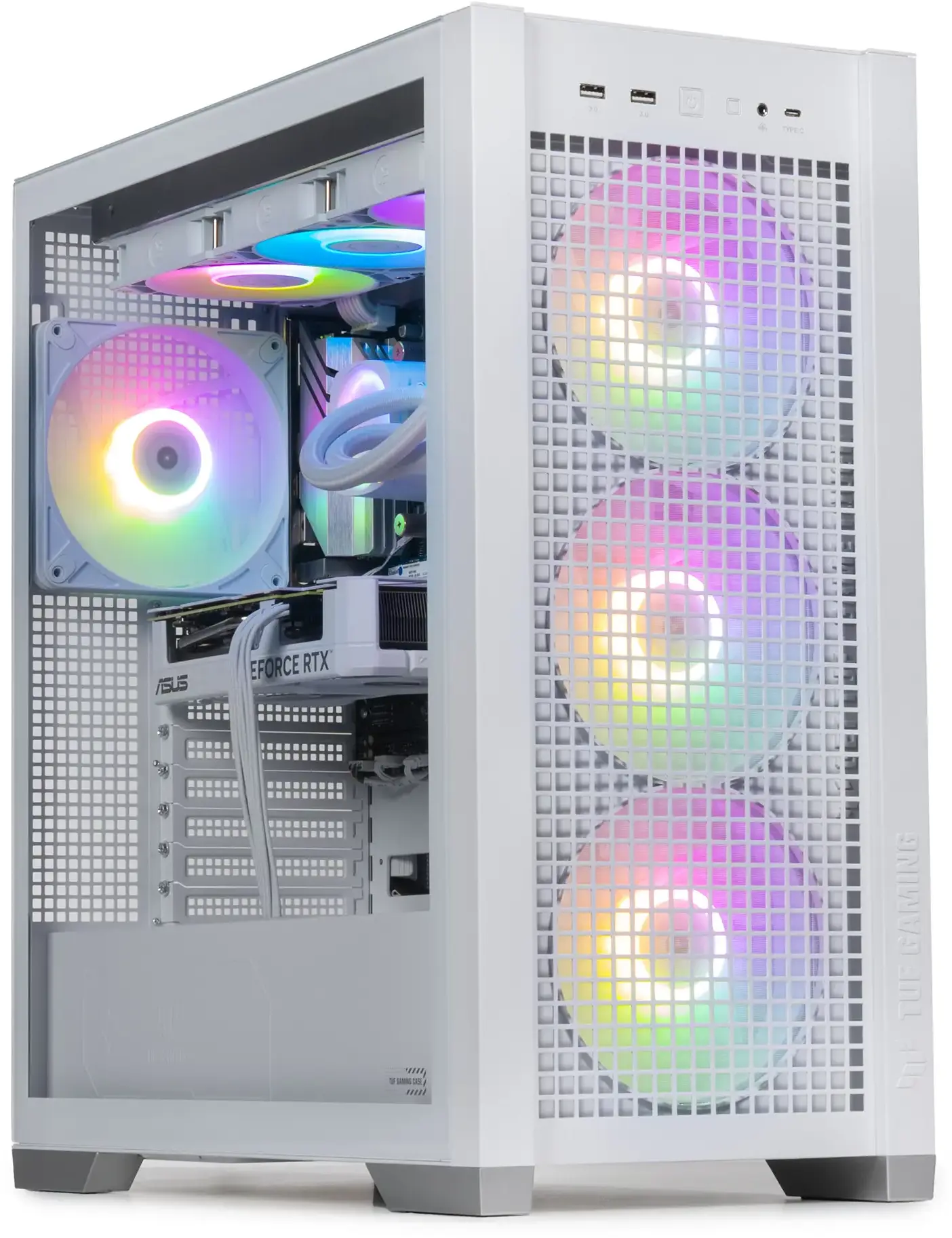 Ігровий комп'ютер на базі AMD Ryzen 7 9800X3D оснащений преміальною системою водяного охолодження (360 мм), 64 ГБ оперативної пам'яті DDR5-6000 і високошвидкісним SSD на 2 ТБ M.2 NVMe. Працює на материнській платі TUF GAMING B650-PLUS WIFI з відеокартою NVIDIA GeForce RTX 5090 (32 ГБ). Для стабільної роботи використовується блок живлення на 1600W 80+ Gold, а ефективне охолодження забезпечують 7 RGB-вентиляторів: 3 спереду, 3 зверху і 1 ззаду. Комп'ютер постачається з попередньо встановленою Windows 11 Pro для максимальної зручності та продуктивності. Дизайн виконано в мінімалістичному і технологічному стилі, підкреслюючи практичність і естетику. Передня панель із сітчастою структурою забезпечує ефективний приплив повітря, а RGB-підсвітка вентиляторів додає яскравий акцент і створює сучасний ігровий вигляд. Бічна панель із загартованого скла демонструє внутрішні компоненти, підкреслюючи потужність системи й акуратність складання.