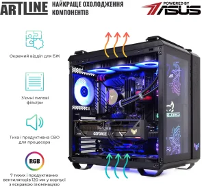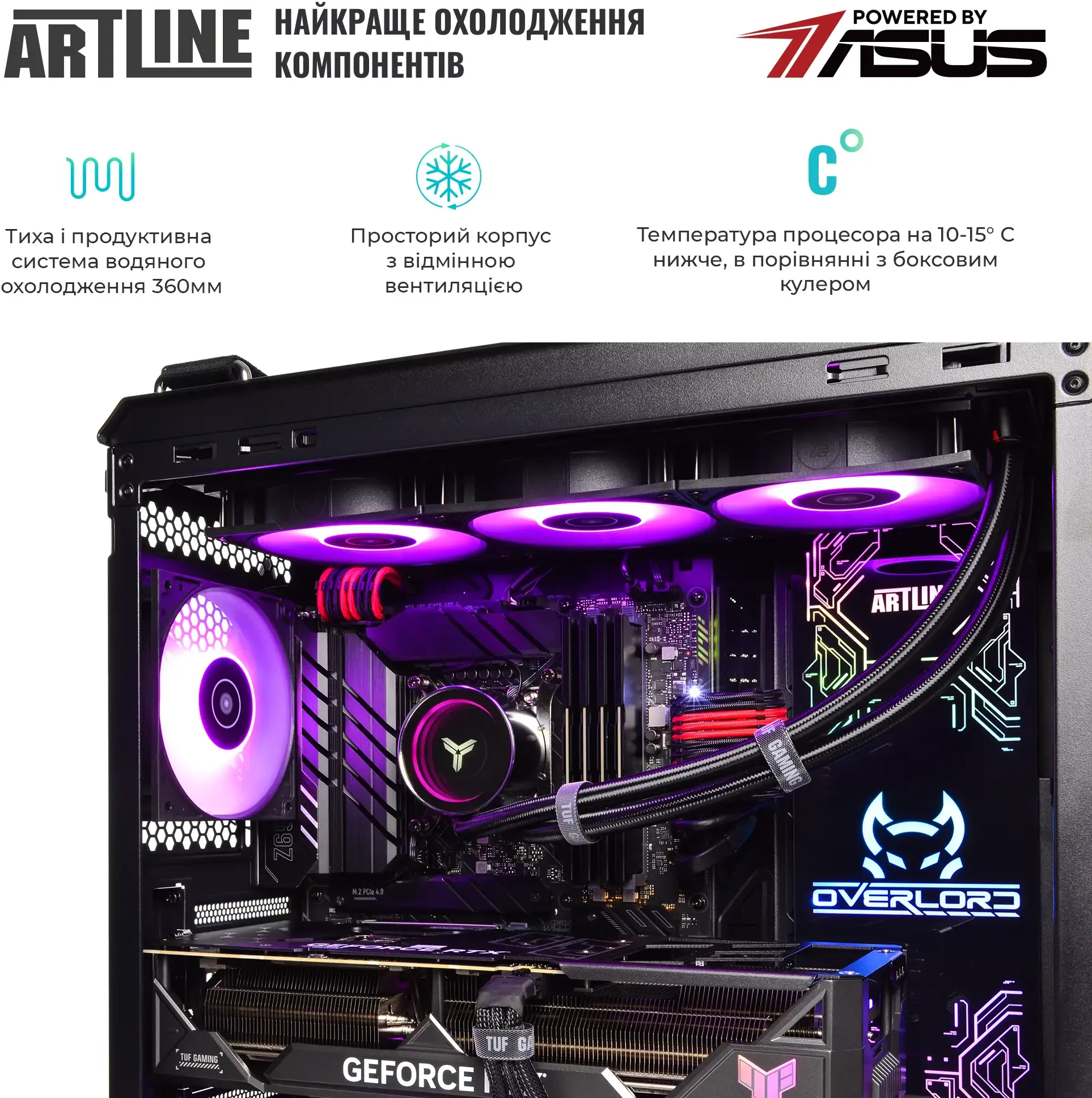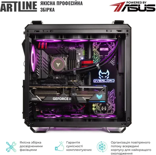 Комп'ютер ARTLINE Overlord GT502 (GT502v114w) - високопродуктивна ігрова система у білому корпусі ASUS TUF Gaming GT502 White. Оснащений 24-ядерним процесором Intel Core Ultra 9 285K із тактовою частотою 3.2–5.7 ГГц та системою водяного охолодження Premium 360mm WaterCooler White, що забезпечує ефективне тепловідведення. 32 ГБ оперативної пам'яті DDR5-6400 та SSD-накопичувач об'ємом 2 ТБ NVMe Gen4 гарантують швидке завантаження та роботу додатків. Відеокарта NVIDIA GeForce RTX 5070 Ti з 16 ГБ пам'яті забезпечує відмінну графічну продуктивність. Модульний дизайн корпусу, RGB-підсвічування вентиляторів та загартоване скло на передній та бічній панелях надають пристрою сучасного та стильного вигляду. Додаткові особливості включають пиловий фільтр на верхній панелі, ручки для перенесення та індивідуальне кольорове обплетення кабелів. Блок живлення потужністю 850 Вт із сертифікацією 80+ Bronze забезпечує стабільну роботу системи. Передвстановлена операційна система Windows 11 Home забезпечує сучасний та зручний інтерфейс. Габарити: 450x285x446 мм; вага: 20 кг. Гарантія: 38 місяців. Комплектація: ПК, технічний паспорт, кабель живлення.