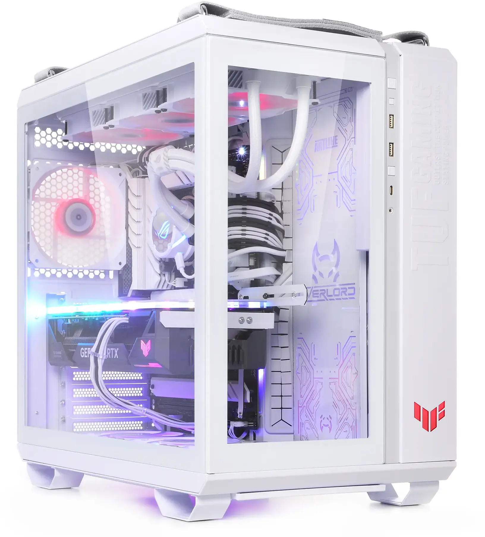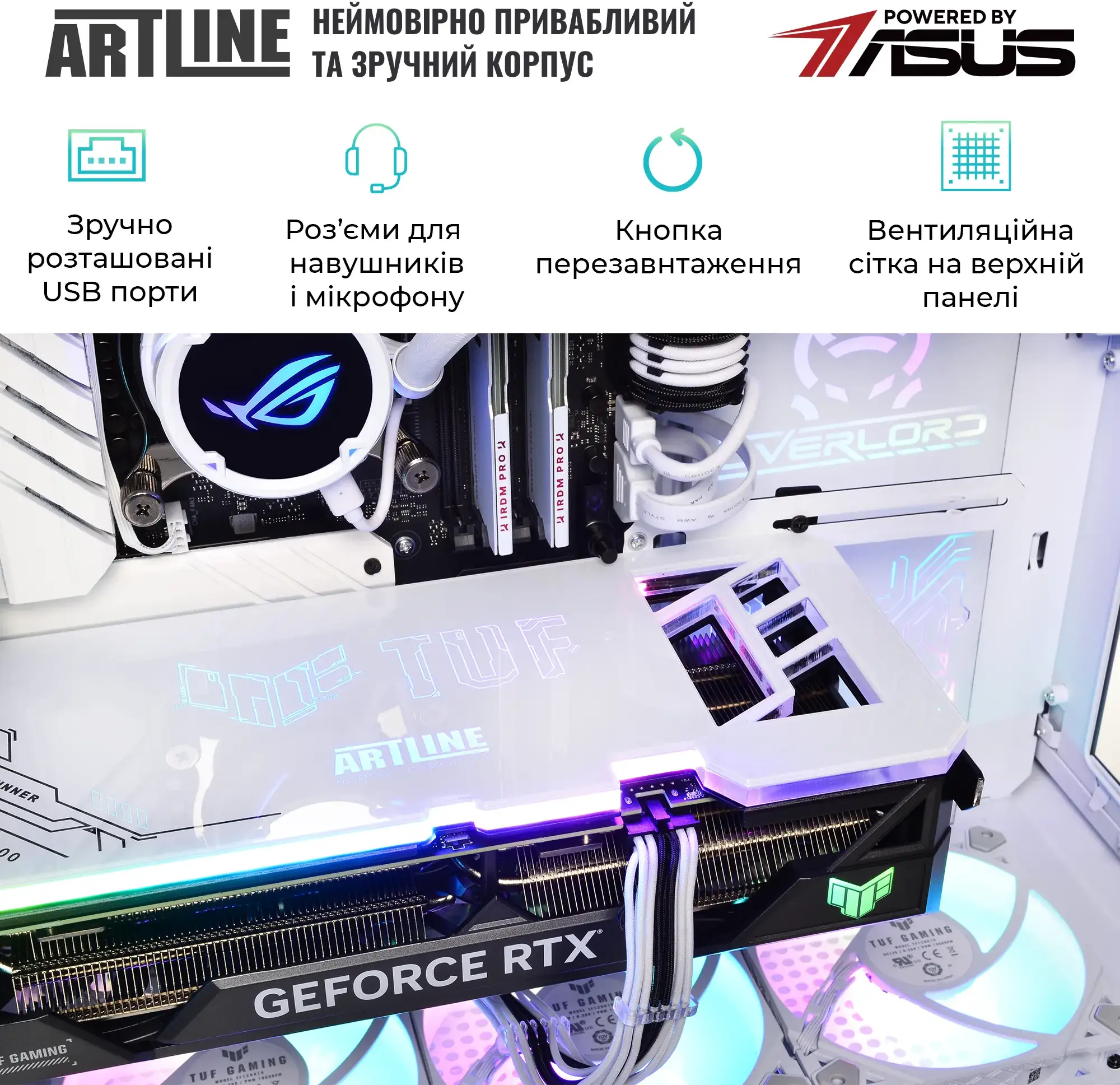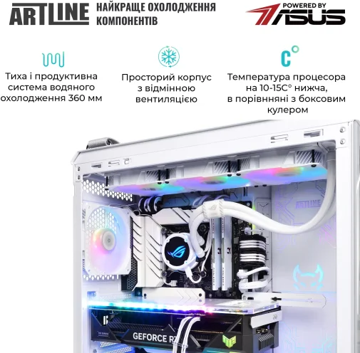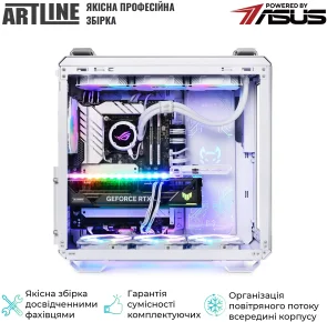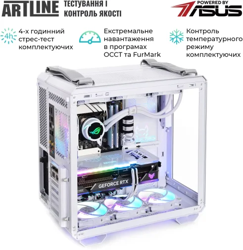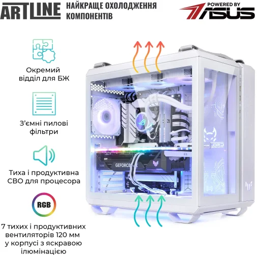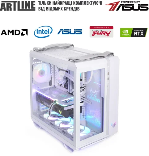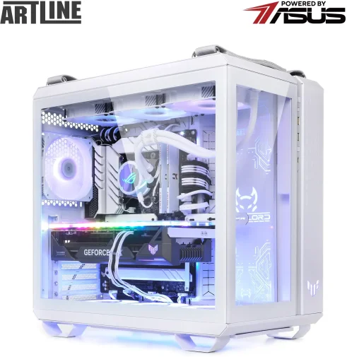 Комп'ютер ARTLINE Overlord GT502 (GT502v114w) - високопродуктивна ігрова система у білому корпусі ASUS TUF Gaming GT502 White. Оснащений 24-ядерним процесором Intel Core Ultra 9 285K із тактовою частотою 3.2–5.7 ГГц та системою водяного охолодження Premium 360mm WaterCooler White, що забезпечує ефективне тепловідведення. 32 ГБ оперативної пам'яті DDR5-6400 та SSD-накопичувач об'ємом 2 ТБ NVMe Gen4 гарантують швидке завантаження та роботу додатків. Відеокарта NVIDIA GeForce RTX 5070 Ti з 16 ГБ пам'яті забезпечує відмінну графічну продуктивність. Модульний дизайн корпусу, RGB-підсвічування вентиляторів та загартоване скло на передній та бічній панелях надають пристрою сучасного та стильного вигляду. Додаткові особливості включають пиловий фільтр на верхній панелі, ручки для перенесення та індивідуальне кольорове обплетення кабелів. Блок живлення потужністю 850 Вт із сертифікацією 80+ Bronze забезпечує стабільну роботу системи. Передвстановлена операційна система Windows 11 Home забезпечує сучасний та зручний інтерфейс. Габарити: 450x285x446 мм; вага: 20 кг. Гарантія: 38 місяців. Комплектація: ПК, технічний паспорт, кабель живлення.